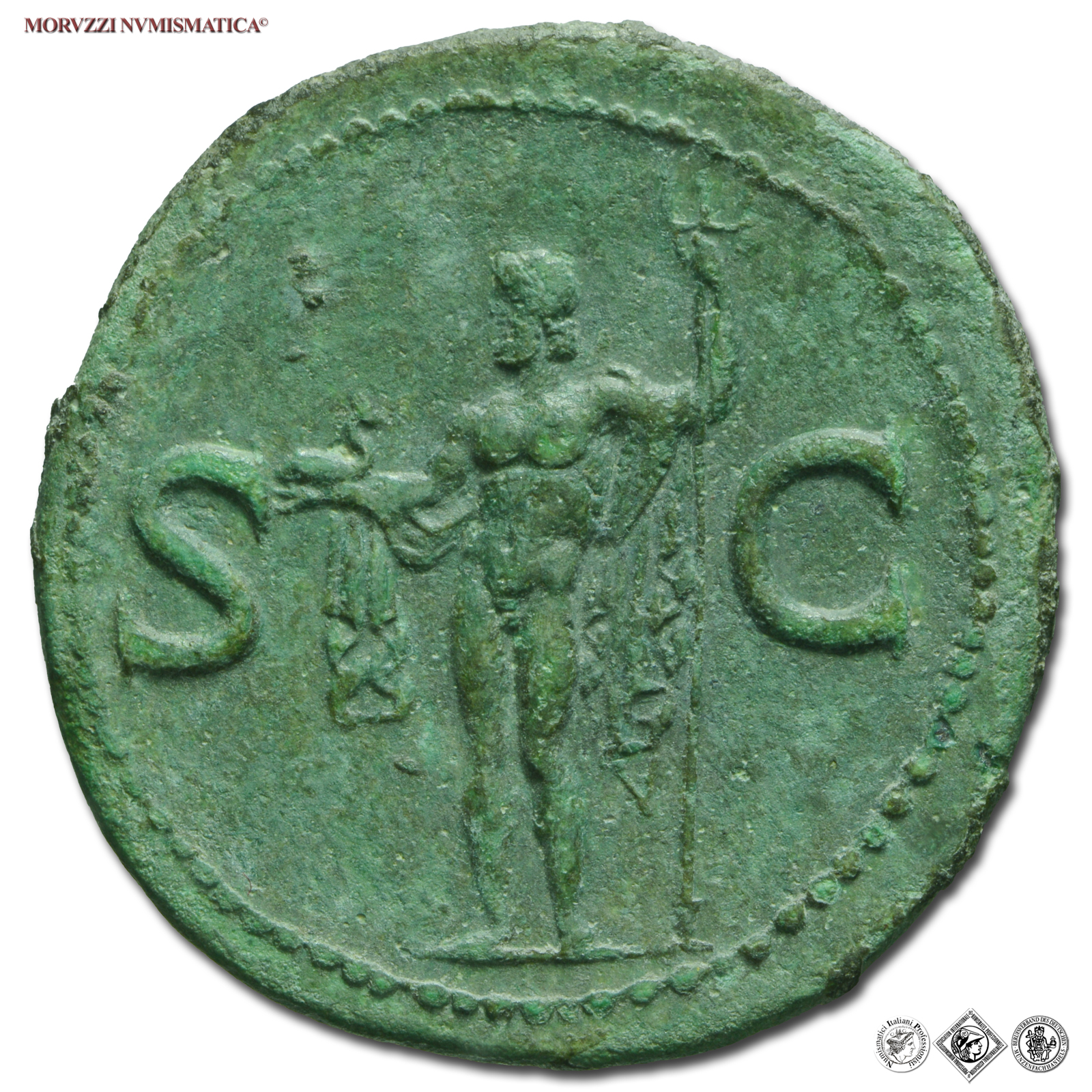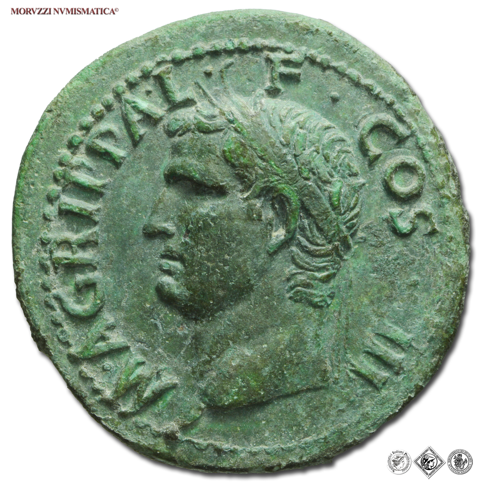 Impero Romano, AGRIPPA, + 12 a.C., ASSE, Emissione: 37-41 d.C., D/ M AGRIPPA L F COS III, testa con corona rostrata a sinistra, R/ S C, Nettuno stante di fronte volto a sinistra con tridente e piccolo delfino, Zecca di Roma, Rif. bibl. R.I.C., 58; Cohen, 3; Metallo: AE, gr. 11,95, (MR147988), Diam.: mm. 29,50, SPL