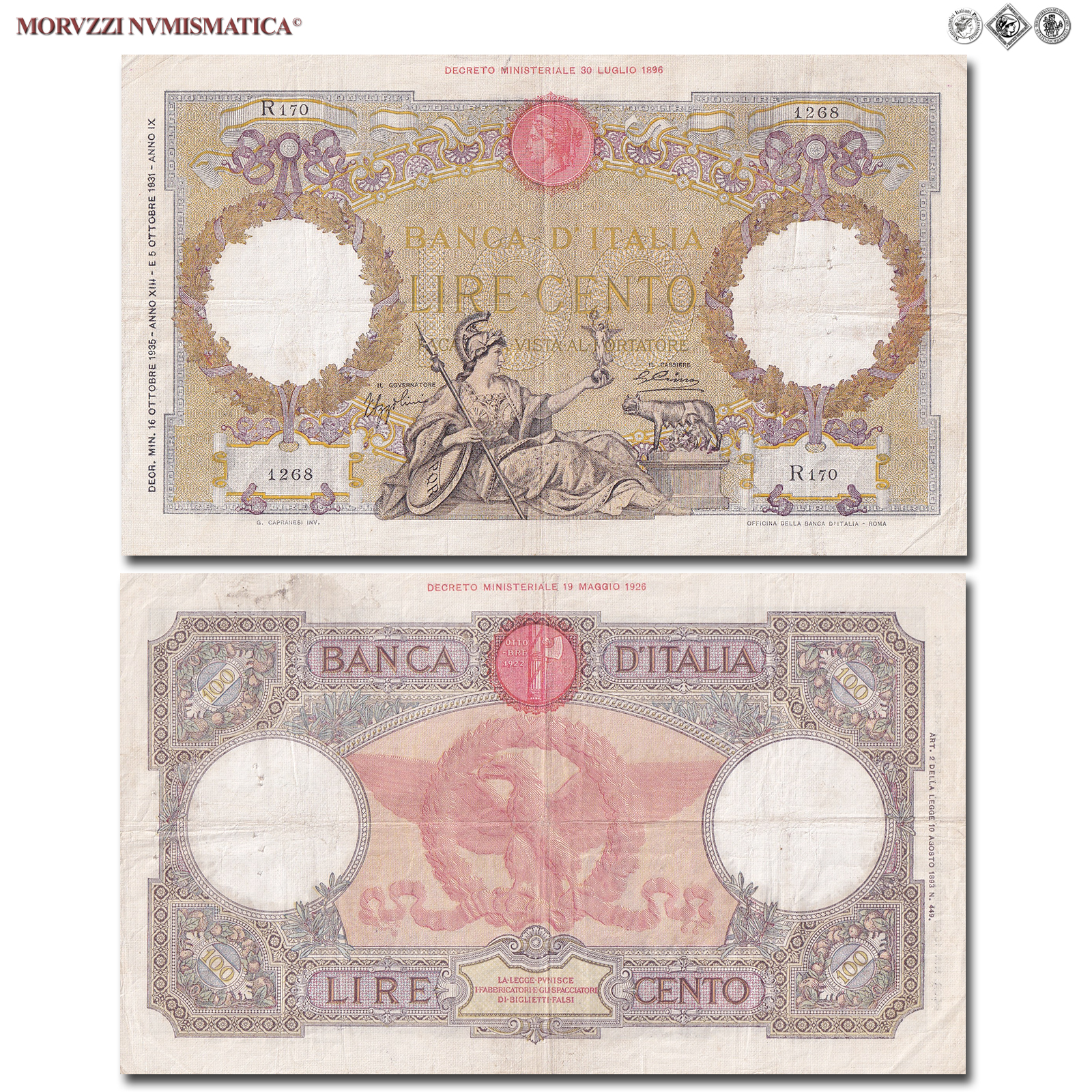 Regno d'Italia, Vittorio Emanuele III, BANCA D'ITALIA, LIRE 100, Capranesi - Aquila romana - fascio (contrassegno di Stato: Testina d'Italia), 16.10.1935, Firme: Azzolini, Cima, mBB, (Crapanzano 231) / banconote italiane (cartamoneta italiana - banconota da collezione)