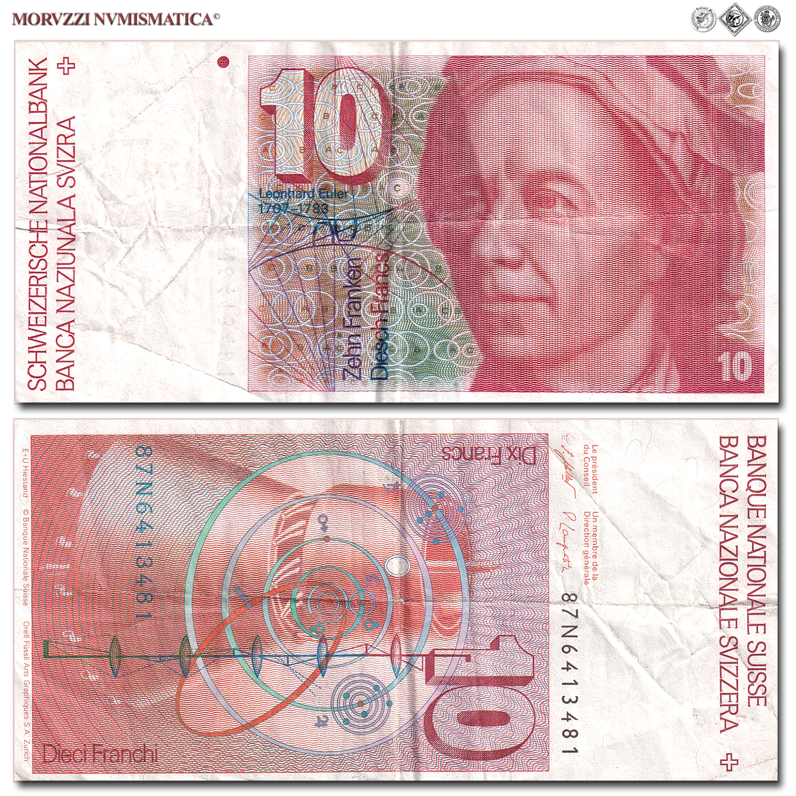 Svizzera, BANCA NAZIONALE SVIZZERA, FRANCHI 10, Leonhard Euler, 1979-2000, Firme: Schaller, Languetin, BB, (Pick 53) / BANQUE NATIONALE SUISSE 10 FRANCS (Zehn Franken / Diesch Francs - Dix Francs / Dieci Franchi - banconote mondiali europee svizzere - banconota mondiale europea da collezione)