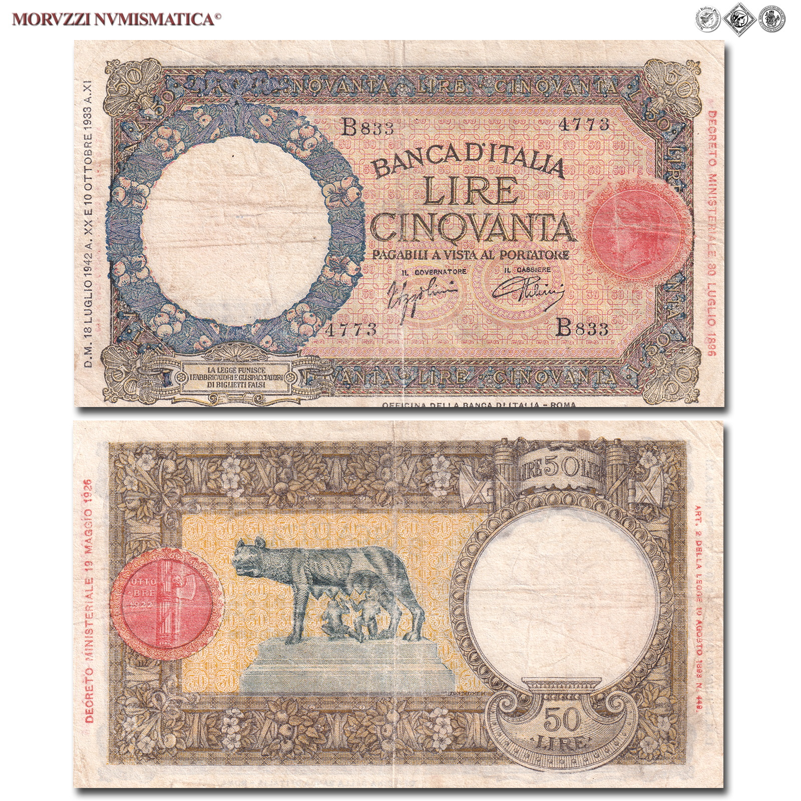 Regno d'Italia, Vittorio Emanuele III, BANCA D'ITALIA, LIRE 50, Lupa capitolina - Testina d'Italia / Fascio Littorio, 18.07.1942, Firme: Azzolini, Urbini, BB, (Crapanzano 124) / banconote italiane (cartamoneta italiana - banconota da collezione)