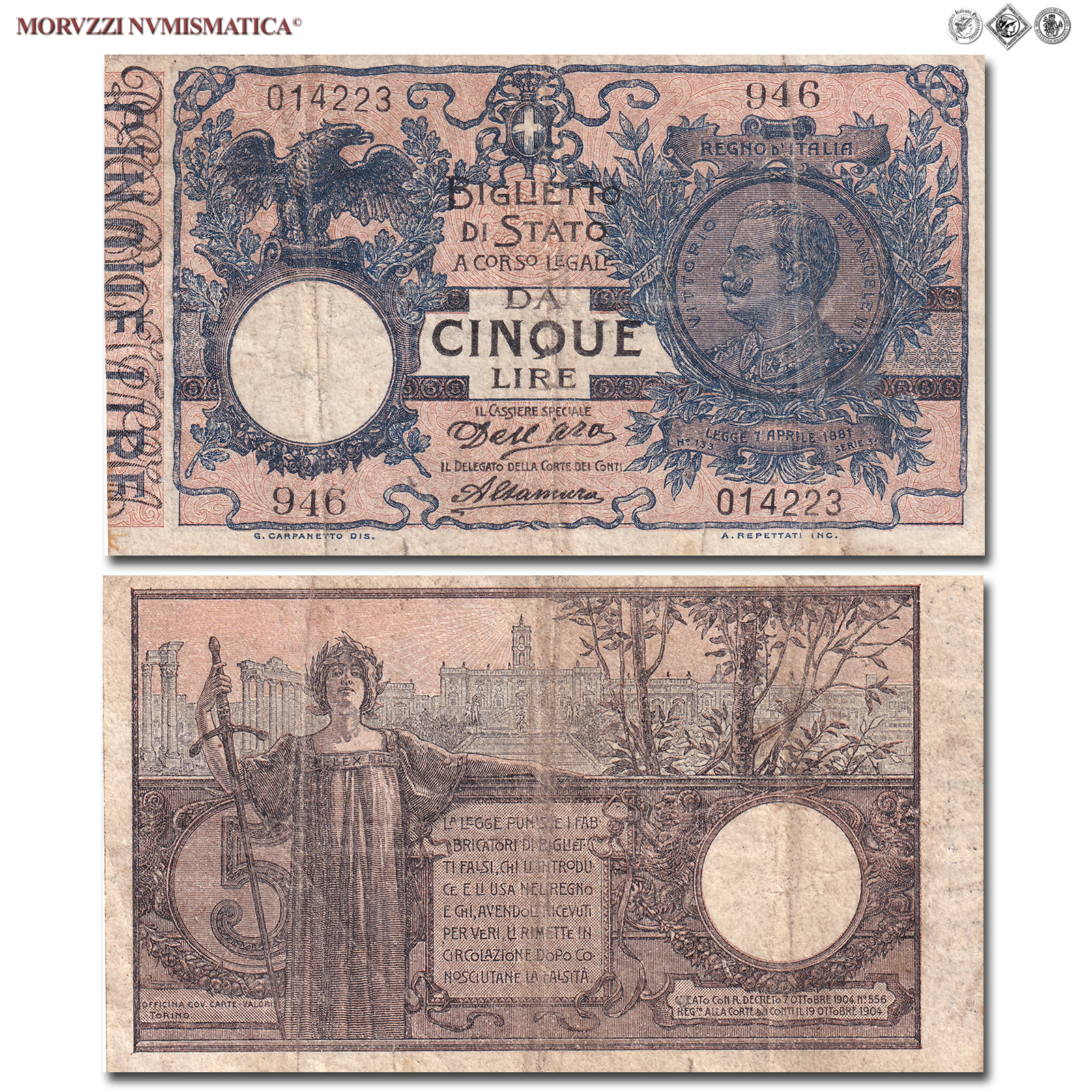 Italia, Vittorio Emanuele III, BIGLIETTO DI STATO, LIRE 5, 27.12.1911, Firme: Dell'Ara, Altamura, BB, (R), (Crapanzano BS21) / banconote italiane rare (cartamoneta italiana rara - banconota da collezione)