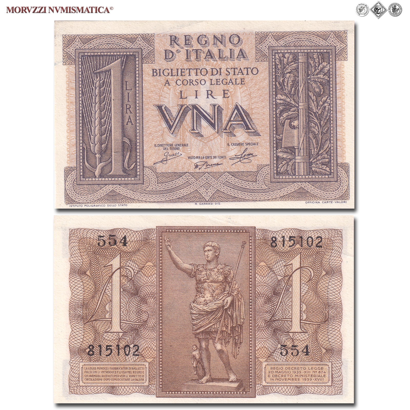 Regno d'Italia, Vittorio Emanuele III, BIGLIETTO DI STATO, LIRA, Impero - Augusto di Prima Porta, 14.11.1939, Firme: Grassi, Porena, Cossu, FDS, (Crapanzano BS6) / banconote italiane (cartamoneta italiana - biglietti da una lira)