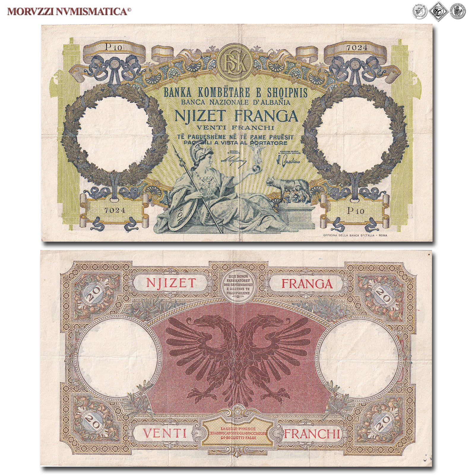 Regno d'Italia e Albania, BANCA NAZIONALE D'ALBANIA, FRANCHI 20, Giugno 1939, Firme: Mosconi, Gambino, mBB, (Crapanzano OI68) / Shqipëria BANKA KOMBËTARE E SHQIPNIS NJIZET FRANGA (banconote albanesi di occupazione da collezione)