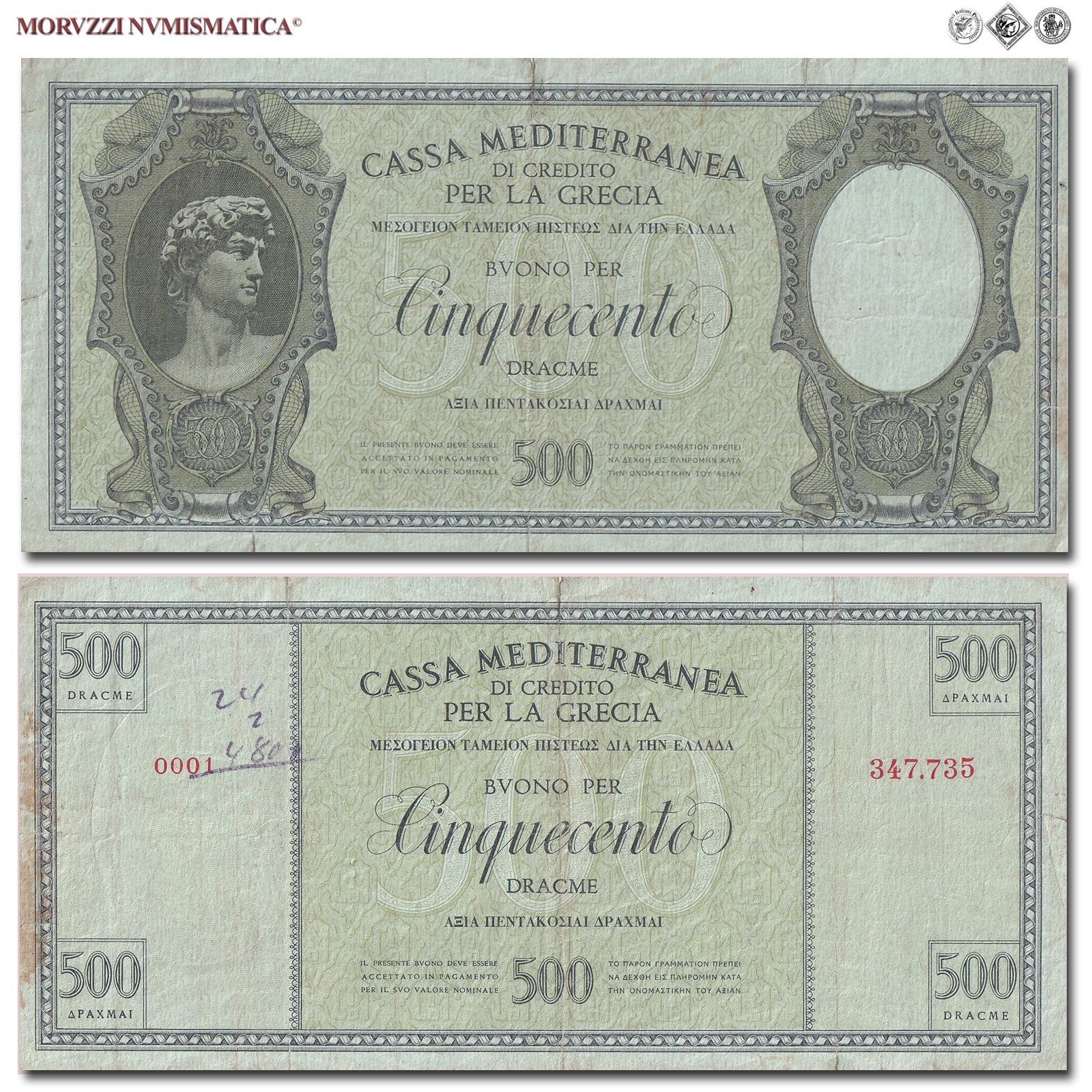 Occupazione italiana della Grecia, CASSA MEDITERRANEA DI CREDITO, DRACME 500, 1941, MB, (RR), (Crapanzano OI74) / banconote rare (cartamoneta rara - banconota da collezione)