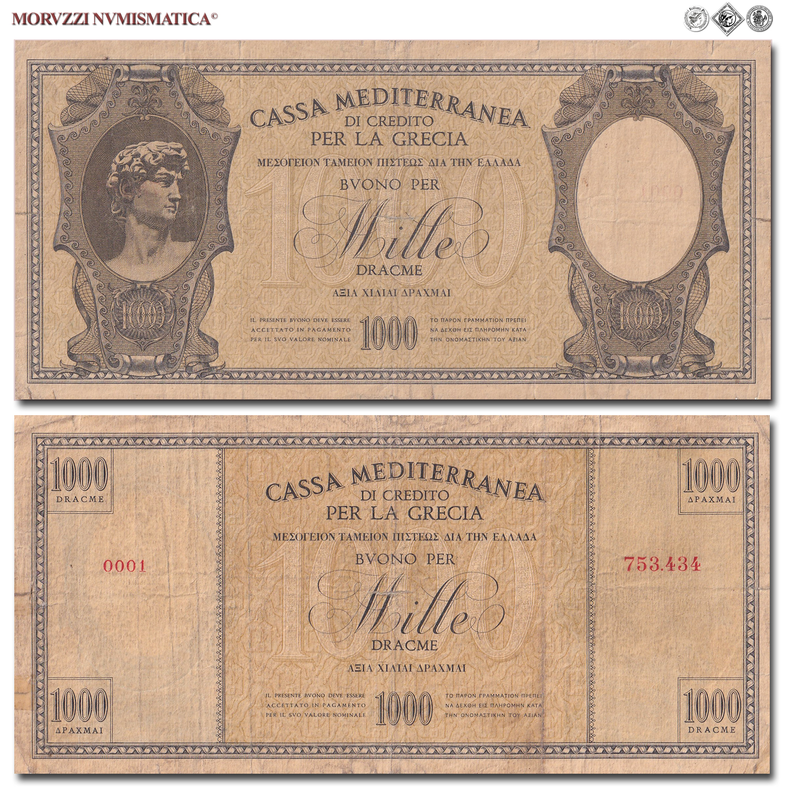 Occupazione italiana della Grecia, CASSA MEDITERRANEA DI CREDITO, DRACME 1000, 1941, qBB, (R), (Crapanzano OI75) / banconote rare da collezione (cartamoneta rara - banconota da 1.000 dracme)
