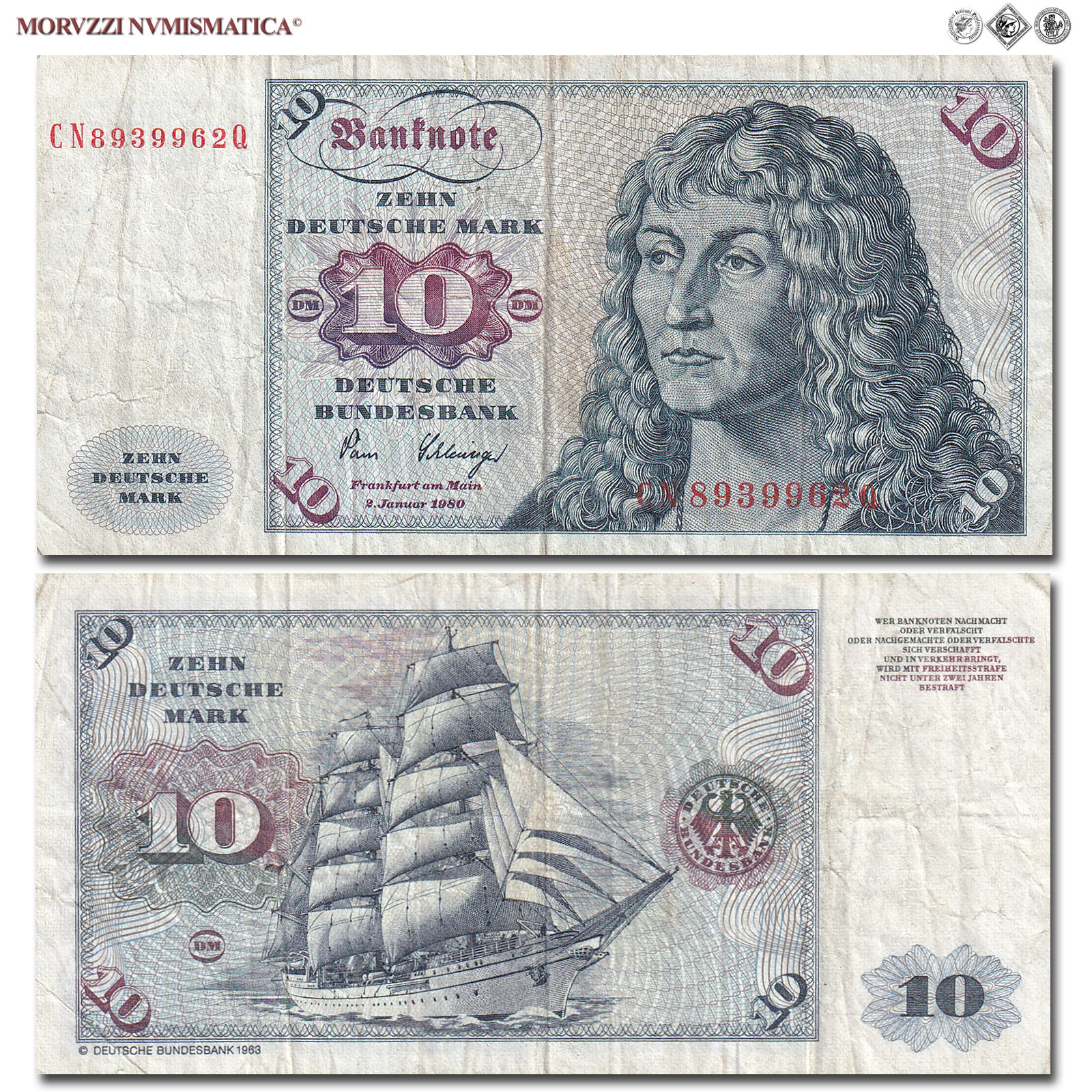 Germania, DEUTSCHE BUNDESBANK, MARCHI 10, Gorch Fock, 02.01.1980, Firme: Pöhl, Schlesinger, BB, (Pick, 31d) / Deutschland ZEHN DEUTSCHE MARK Banknoten (World & German Paper Money - banconote mondiali europee tedesche - banconota mondiale europea tedesca)