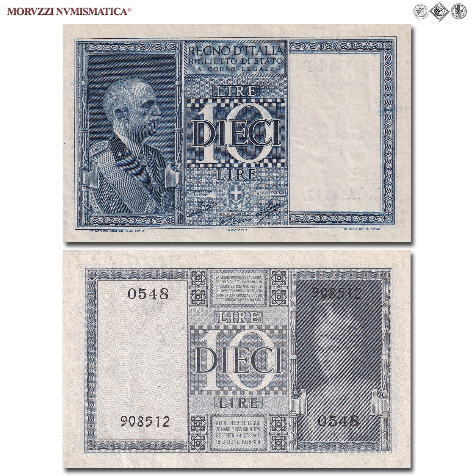 Regno d'Italia, Vittorio Emanuele III, BIGLIETTO DI STATO, LIRE 10, Impero, 1939 XVIII, Impero, Firme: Grassi, Porena, Cossu, qFDS, (Crapanzano BS45) / banconote italiane (cartamoneta italiana - banconota da collezione)