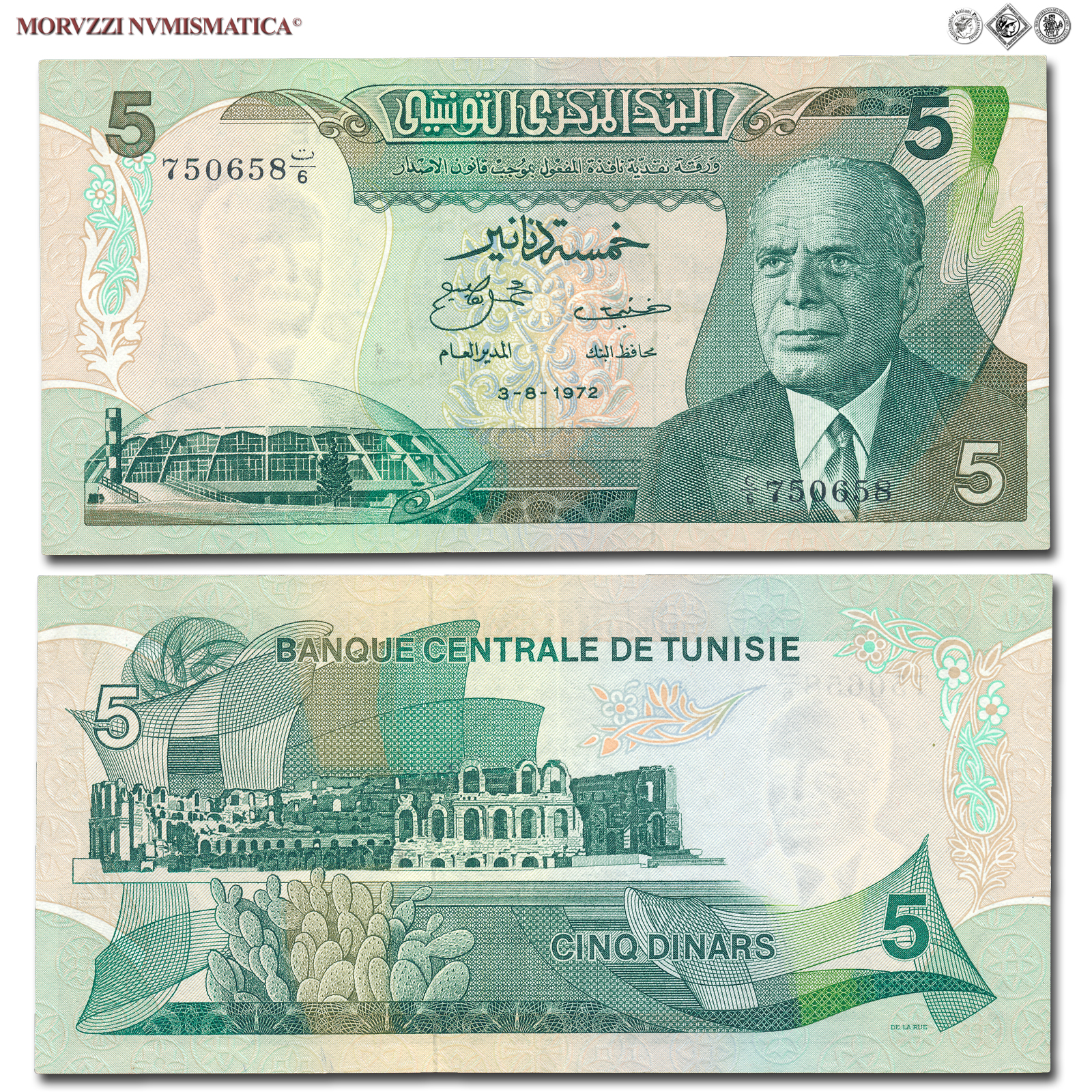 TUNISIA, Banque Centrale de Tunisie, 5 DINARS, 3.08.1972, mSPL, (Bruce 68) / banconote mondiali islamiche tunisine (banconota mondiale islamica tunisina da collezione)