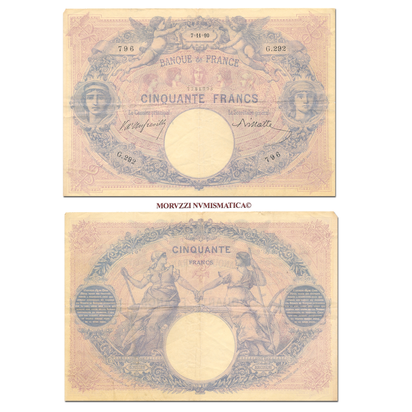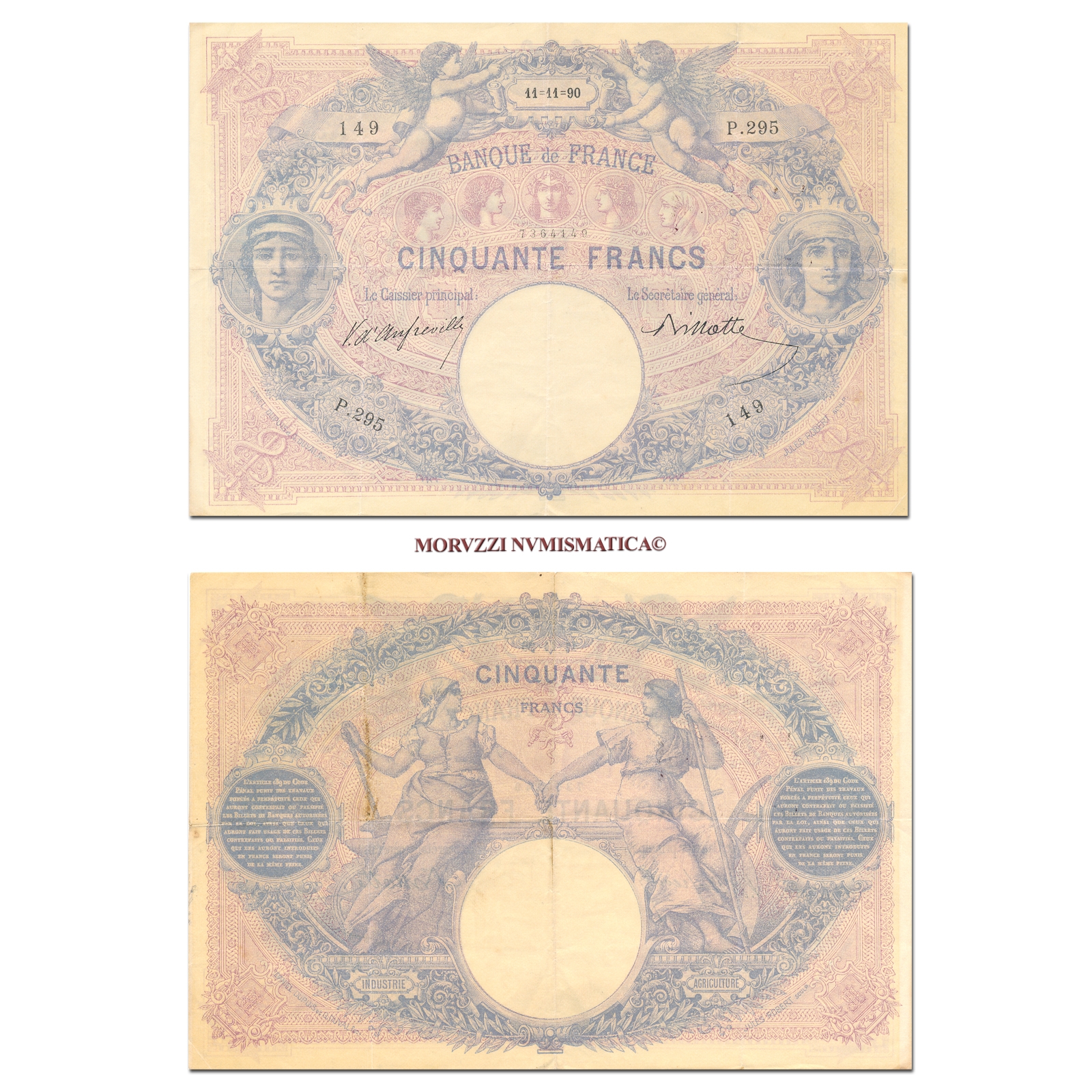 Francia, TERZA REPUBBLICA, BANQUE DE FRANCE, 50 FRANCHI, 07.11.1890, Blu e rosa, Firme: Billotte, E. Bertin, BB, (RR), (Fayette 2) / France Troisième République 50 FRANCS Bleu et rose billets français (WORLD PAPER MONEY - banconote mondiali)