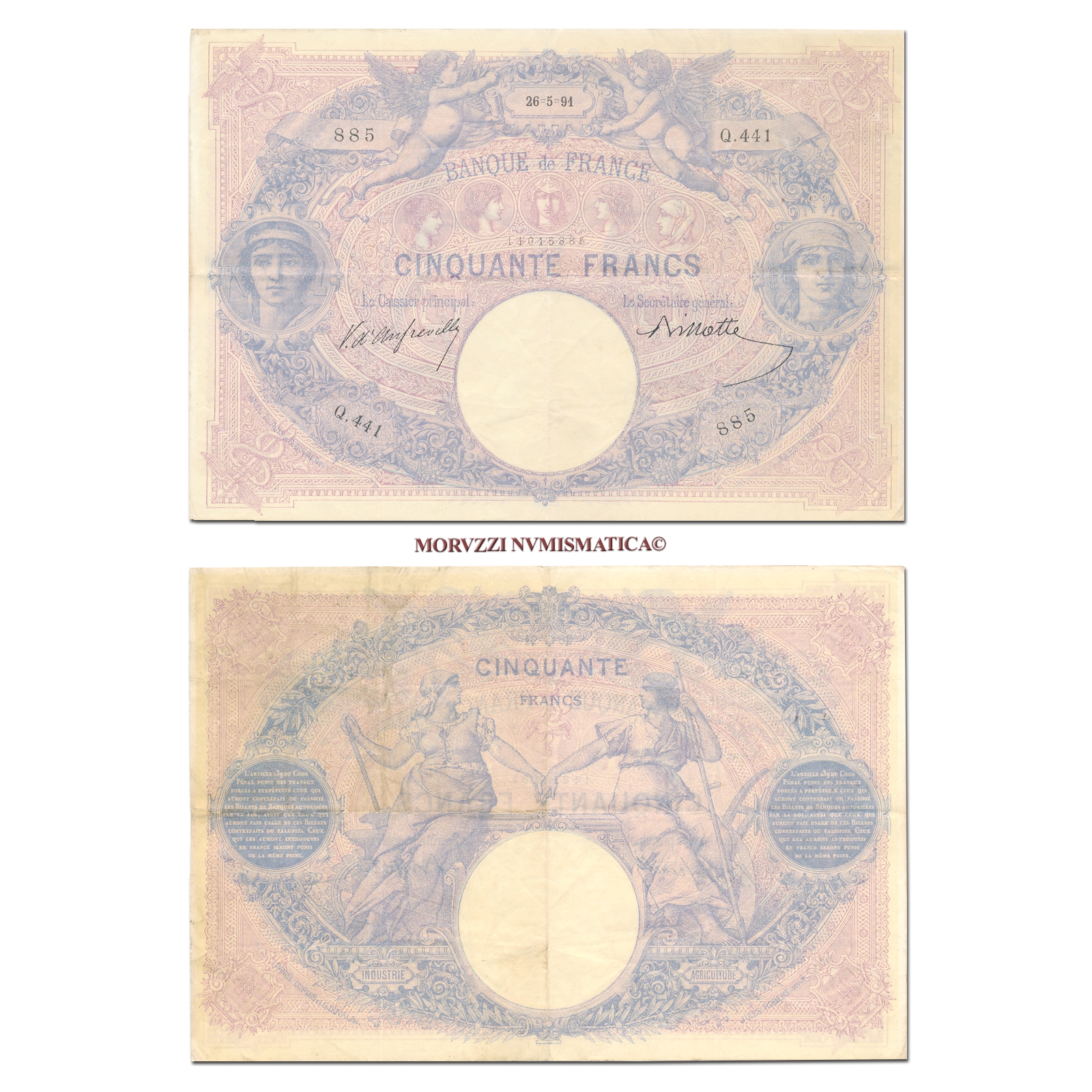 Francia, TERZA REPUBBLICA, BANQUE DE FRANCE, 50 FRANCHI, 26.05.1891, Blu e rosa, Firme: Billotte, E. Bertin, mBB, (RR), (Fayette 3) / France Troisième République 50 FRANCS Bleu et rose billets français (WORLD PAPER MONEY - banconote mondiali)