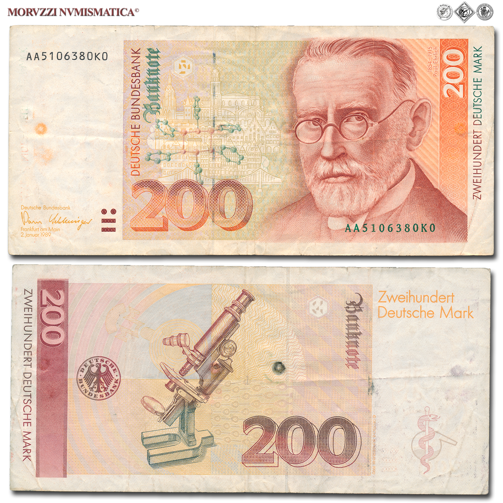 Germania, Repubblica Federale, DEUTSCHE BUNDESBANK, MARCHI 200, 02.01.1989, Firme: Poehl, Schlesinger, BB, (R), (KM 42) / Bundesrepublik Deutschland (BRD) 200 Deutsche Mark Paul Ehrlich (banconote tedesche rare - cartamoneta rara - banconota tedesca)