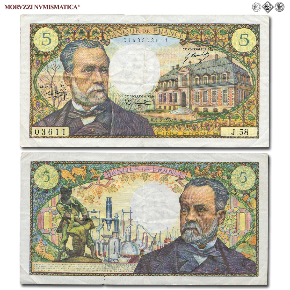 Francia, BANQUE DE FRANCE, FRANCHI 5, Pasteur, 05.05.1967, Firme: H. Morant, G. Bouchet, R. Tondu, mBB, (Fayette 61,5) / République française CINQ FRANCS Billets de banque français (World & French Paper Money - banconote mondiali europee francesi)