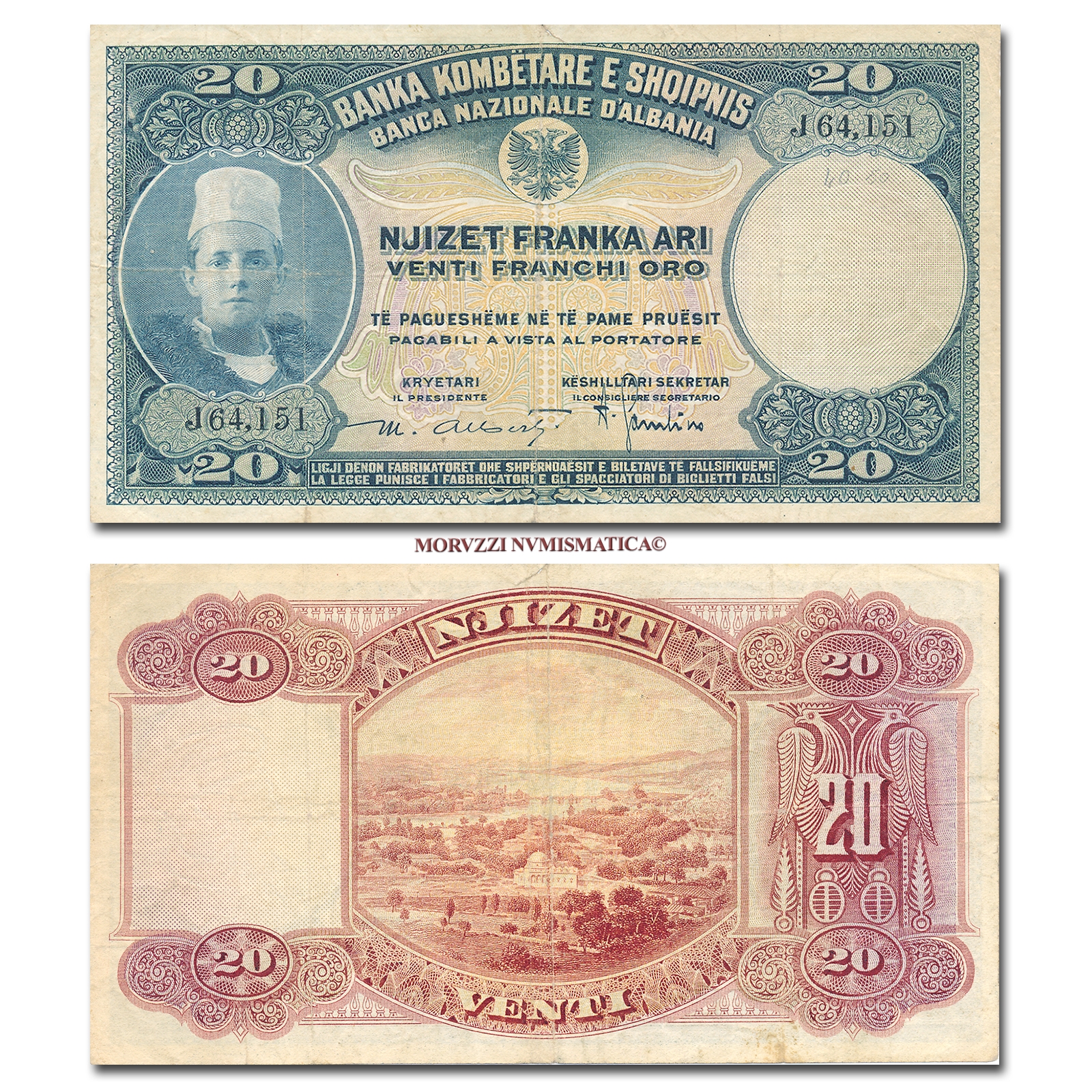 Albania - Protettorato Italiano, BANCA NAZIONALE D'ALBANIA, 20 FRANCHI ORO, Febbraio 1926, (Crapanzano OI 53)