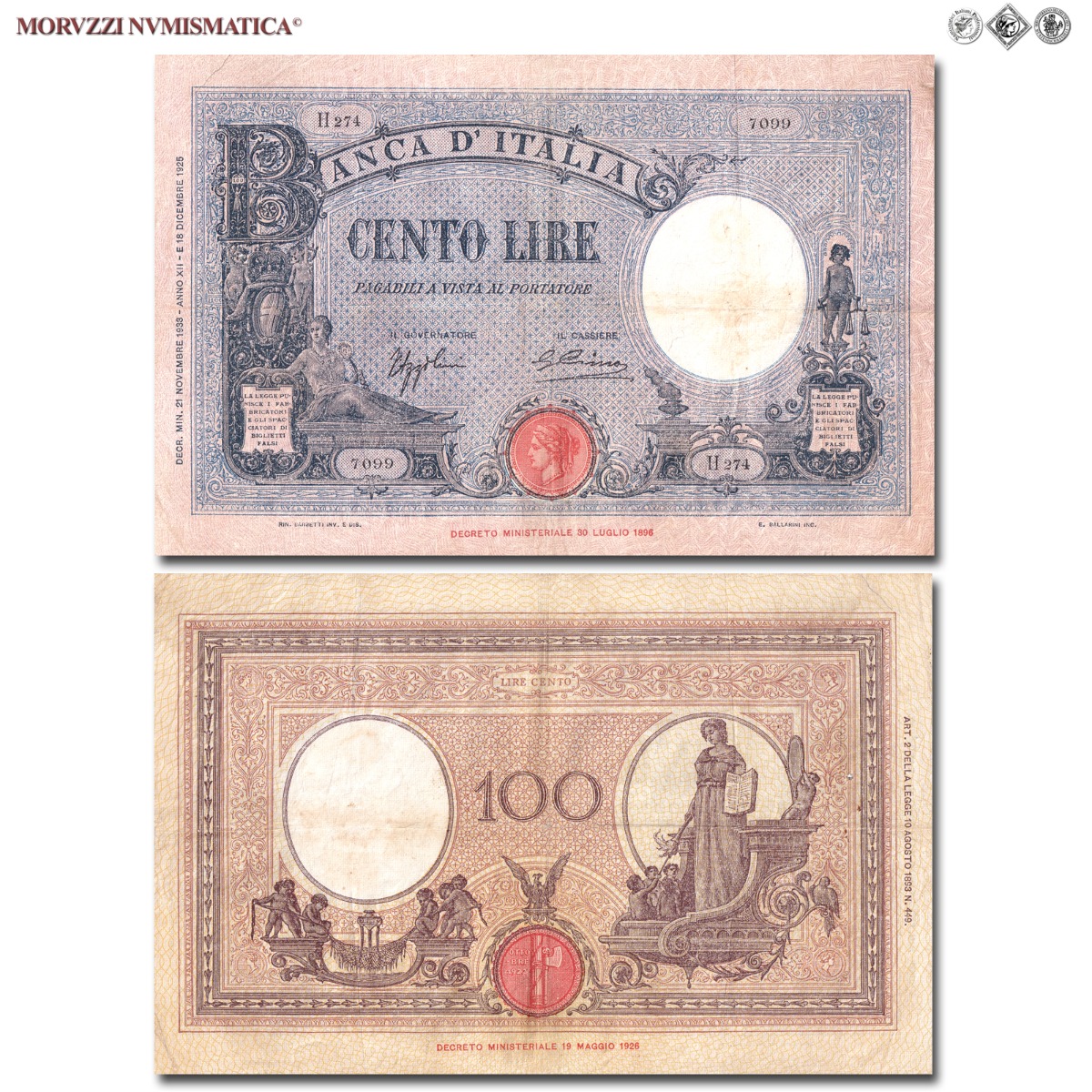 Regno d'Italia, Vittorio Emanuele III, BANCA D'ITALIA, 100 LIRE, 12.08.1929, Barbetti modificato azzurro - fascio (contrassegno di Stato: Testina d'Italia), Firme: Stringher, Cima, mBB, (R), (Crapanzano 212) banconote italiane rare (cartamoneta italiana)