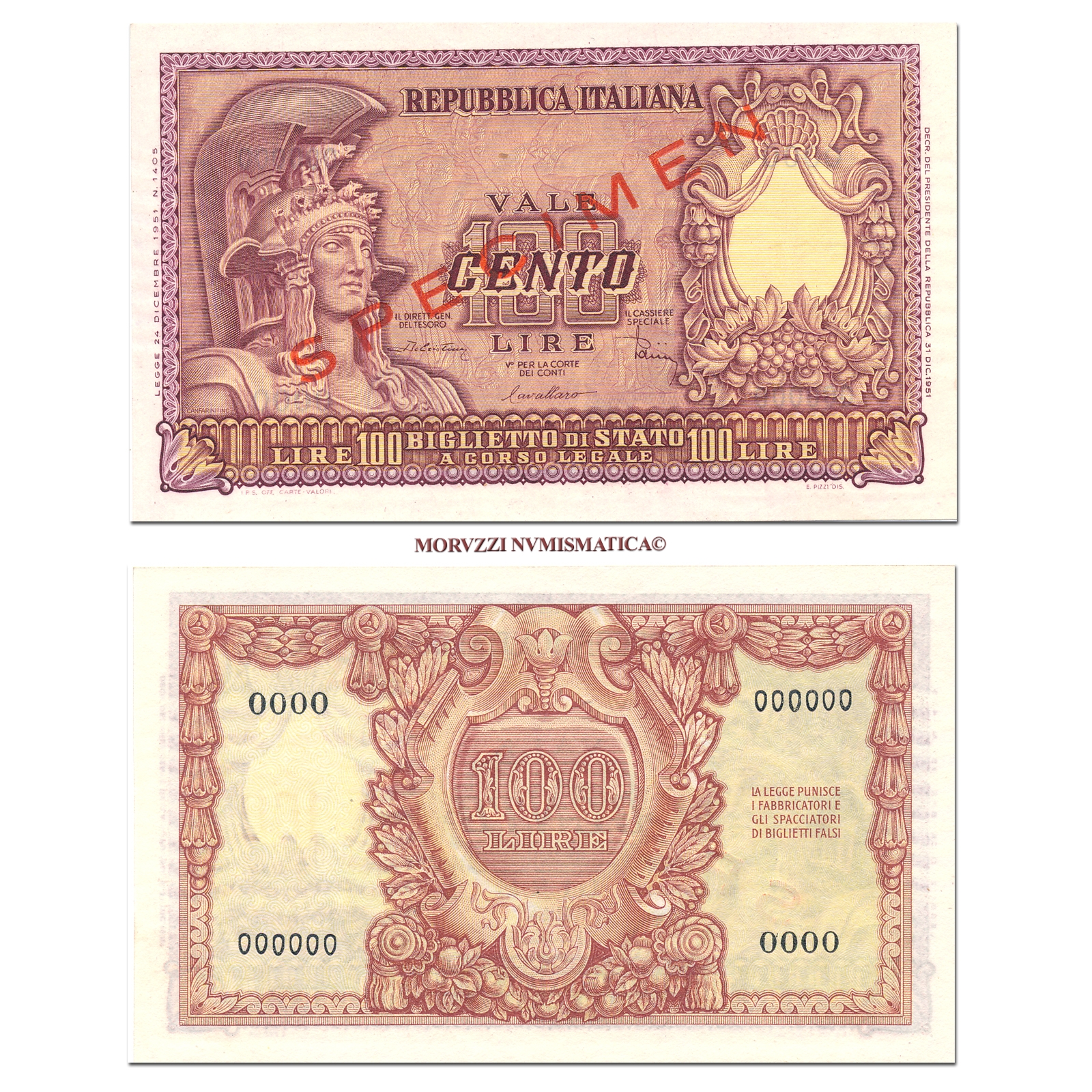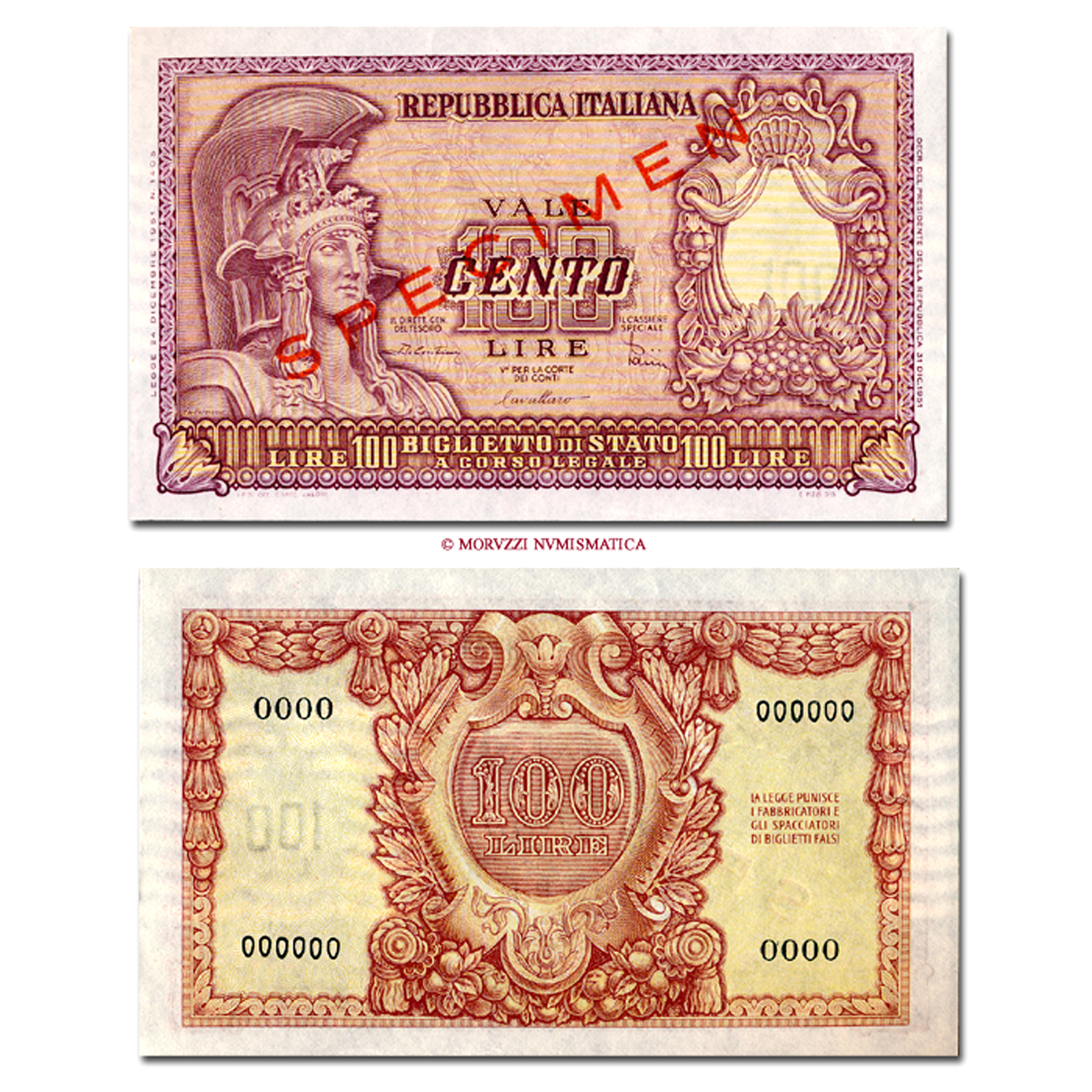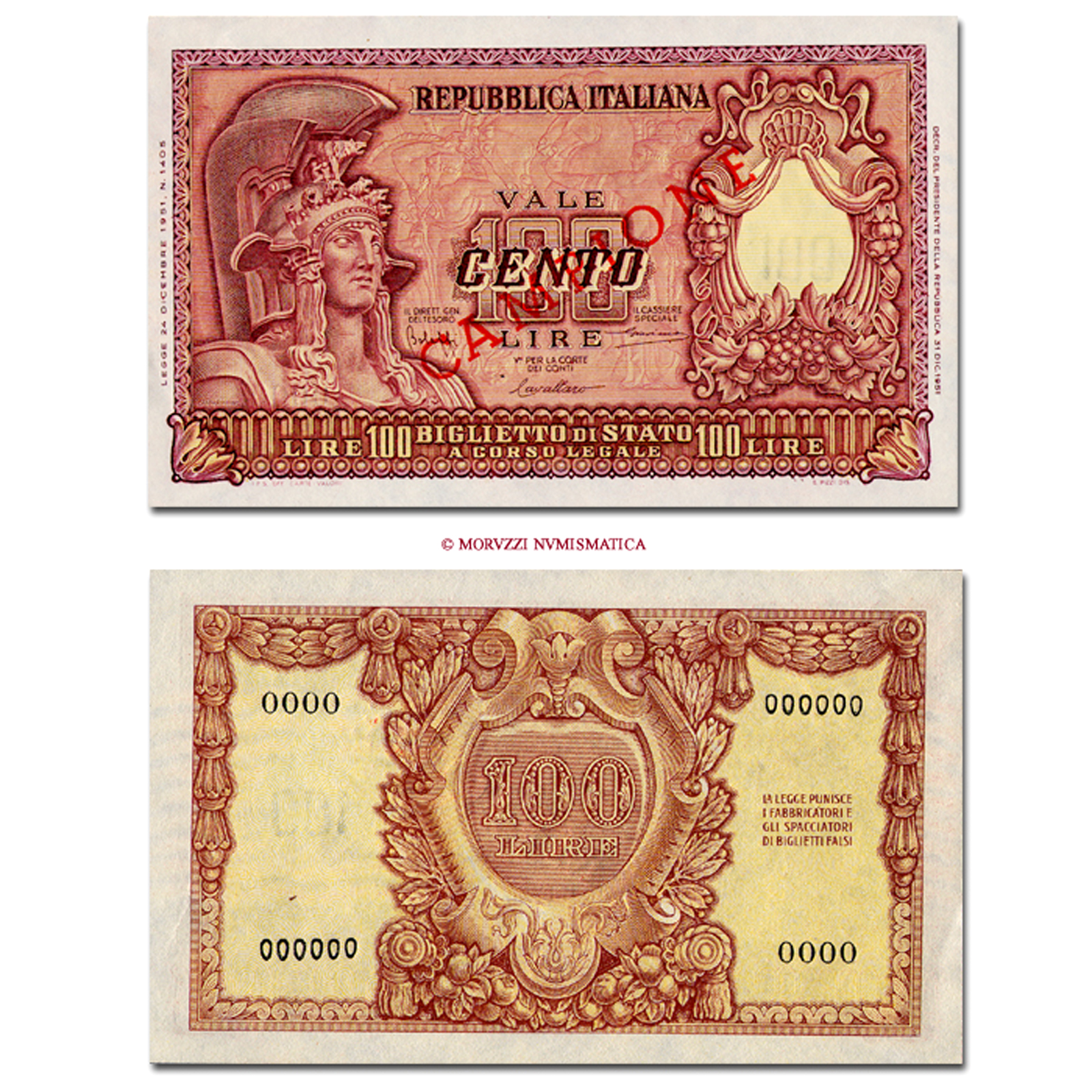 Repubblica Italiana, BIGLIETTO DI STATO, 100 LIRE SPECIMEN, 31.12.1951, Italia elmata, Firme: Di Cristina, Cavallaro, Parisi, FDS, (RR), (Crapanzano cfr. BS 57) / banconote italiane (cartamoneta italiana)