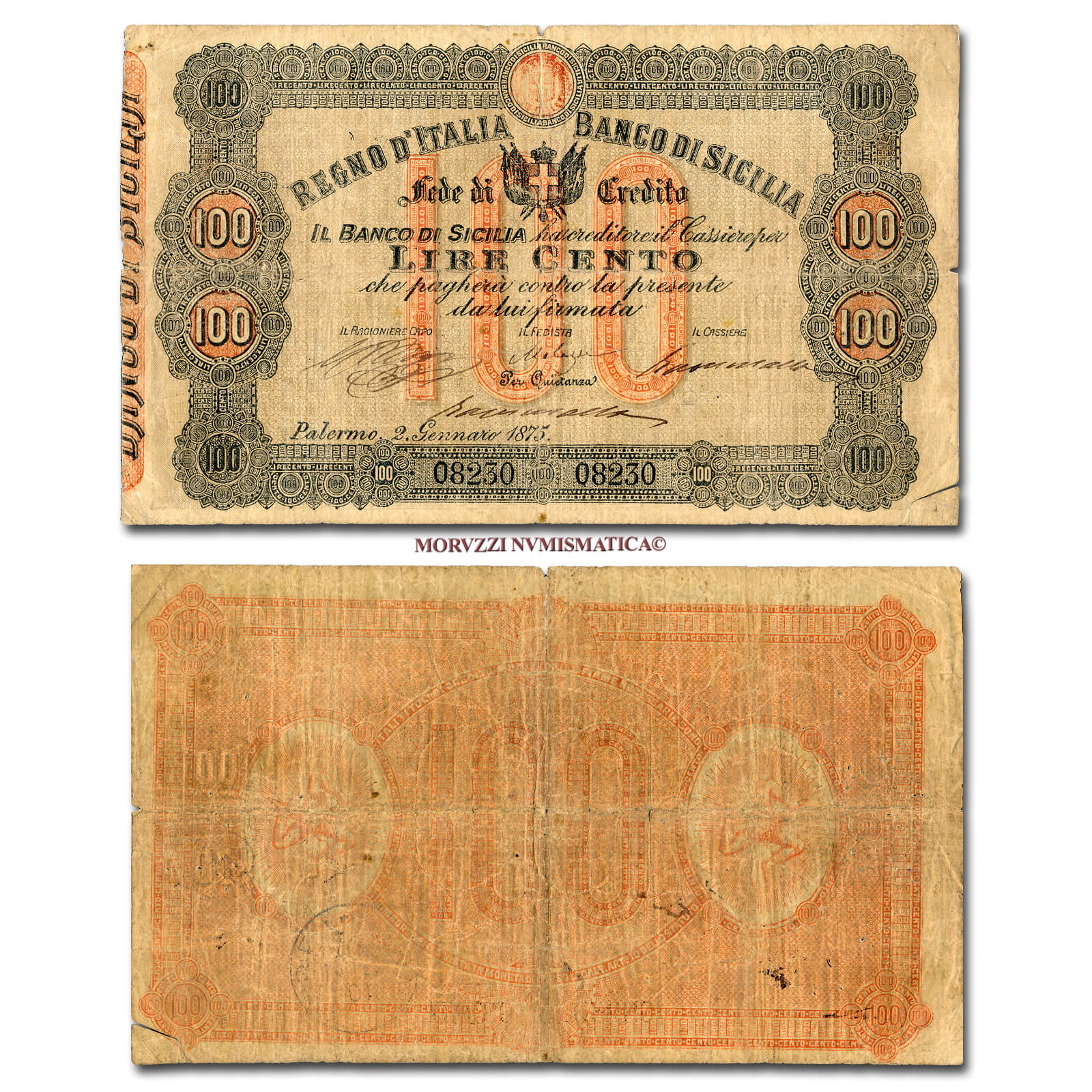 Regno d'Italia,BANCO DI SICILIA,LIRE 100,Fede di Credito,02.01.1875