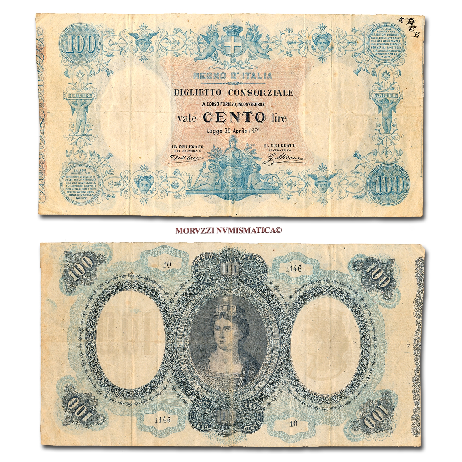 Regno d'Italia, Vittorio Emanuele II, BIGLIETTO CONSORZIALE, 100 LIRE, 30.04.1874, Firme: Dell'Ara, Mirone, mBB, (RRR), (Crapanzano BC7) / banconote italiane rare (cartamoneta italiana rara da collezione - biglietti consorziali rari - banconota da cento)