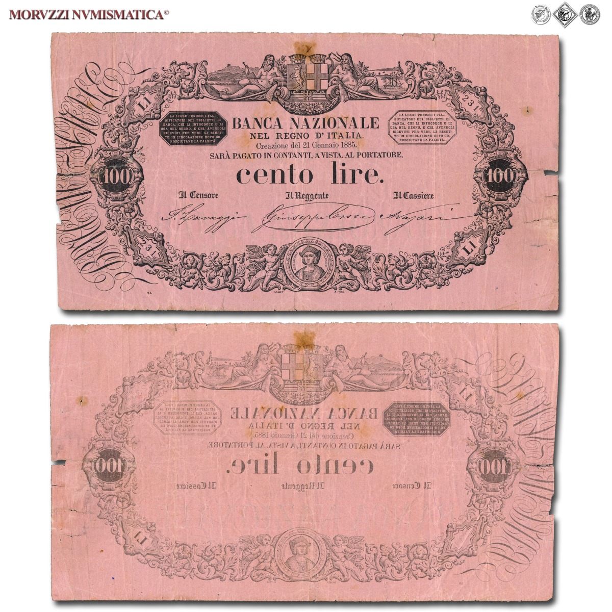 Regno d'Italia, Umberto I, BANCA NAZIONALE NEL REGNO, LIRE 100, 21.01.1885, Firme: Lavaggi, Croce, Nazari, qBB, (Crapanzano BN57) / banconote italiane (cartamoneta italiana da collezione - banconota da cento lire - Casa Savoia)