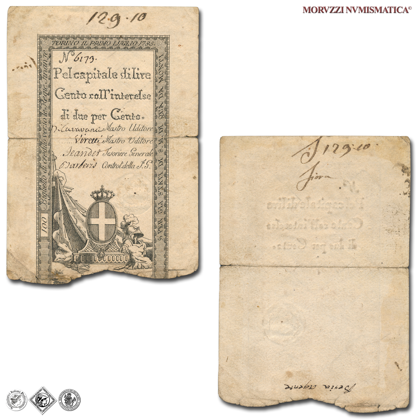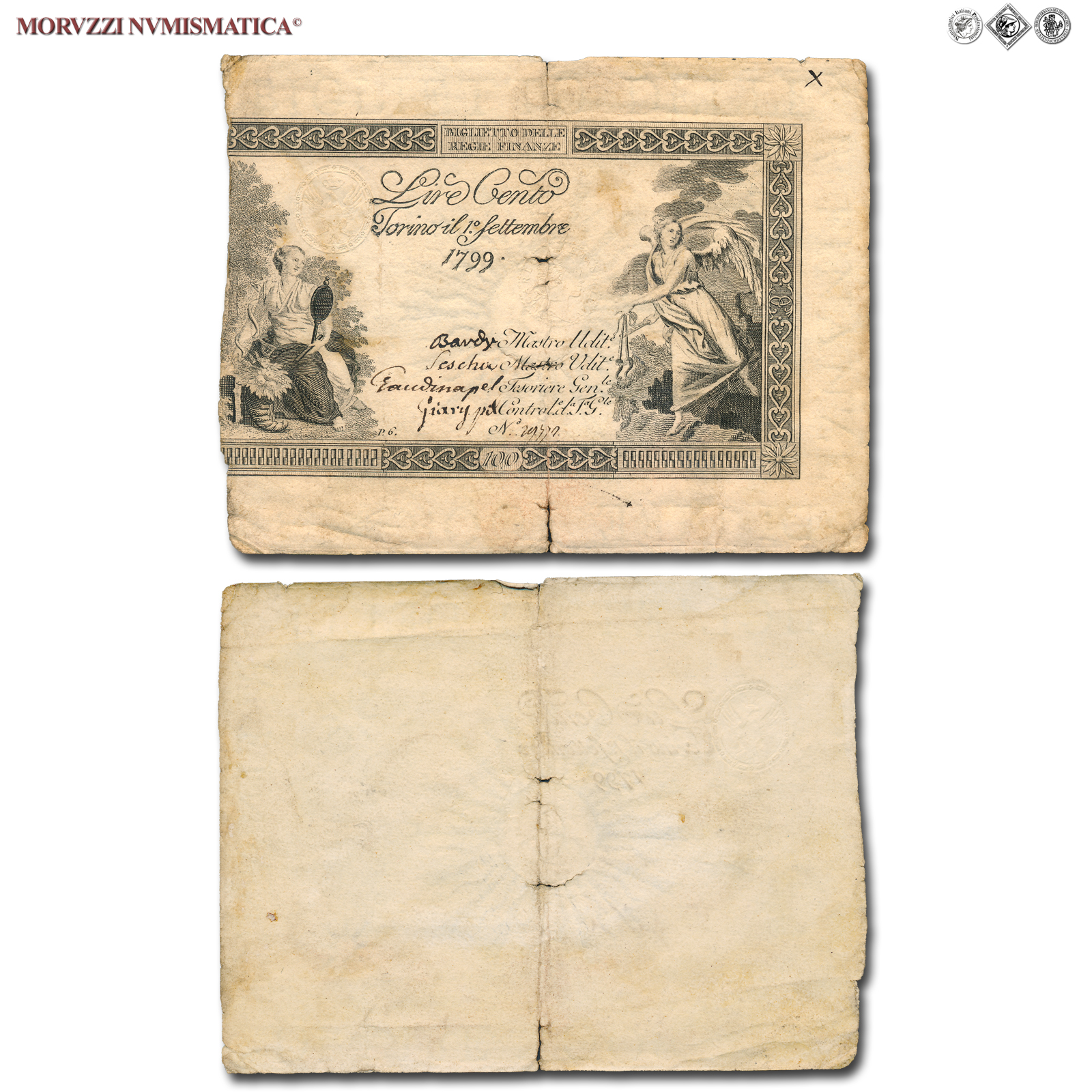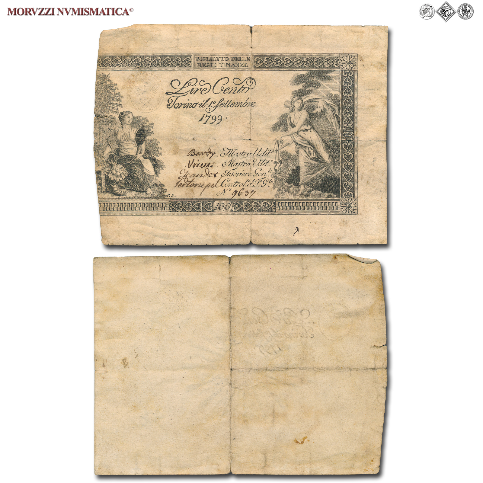 Regno di Sardegna, Carlo Emanuele IV, REGIE FINANZE, LIRE 100, 10° tipo, 01.09.1799, Firme: Bardy, Sesca, Gaudina, Giary, qBB, (NC), (Crapanzano RF46) / banconote italiane (cartamoneta italiana - banconota di Casa Savoia da collezione)