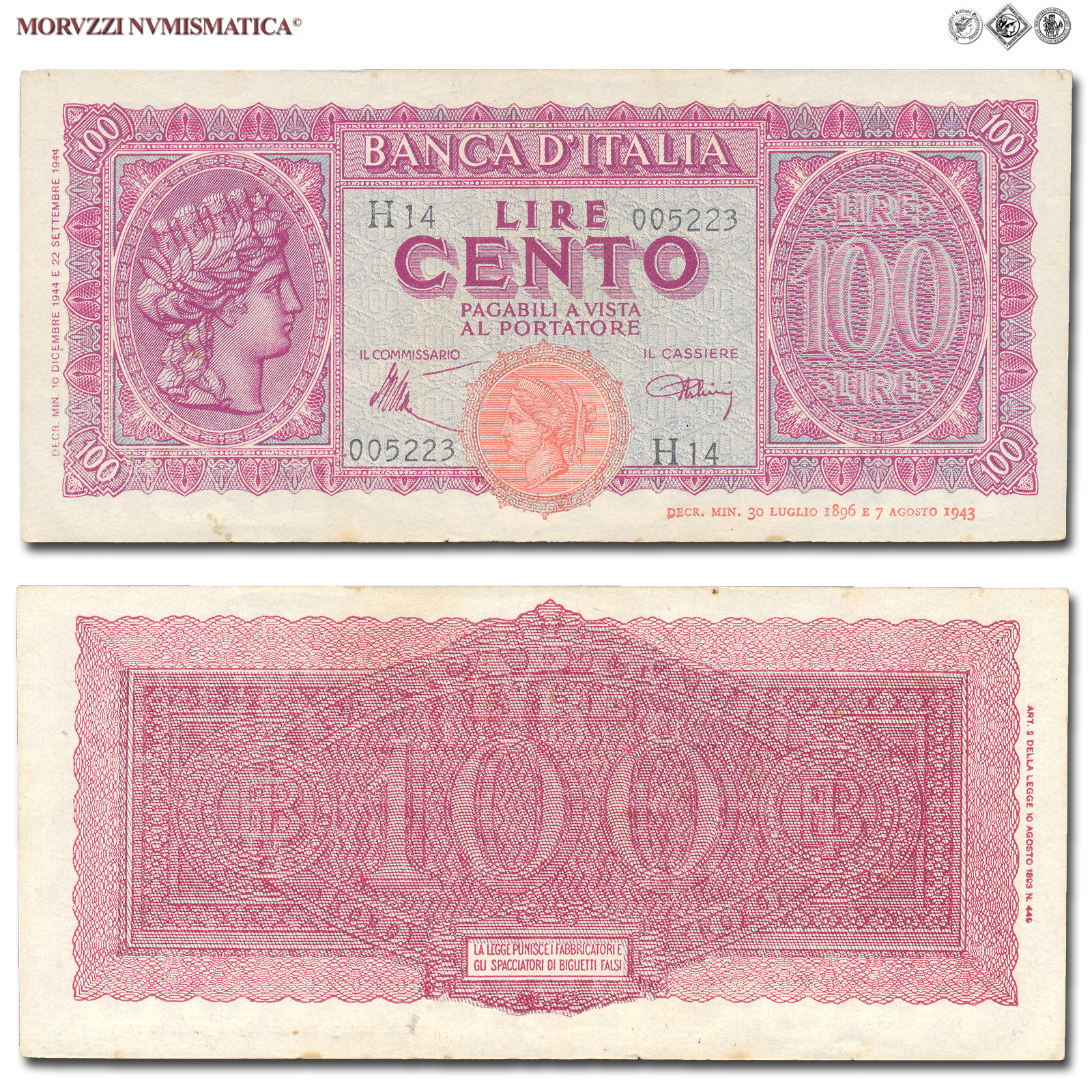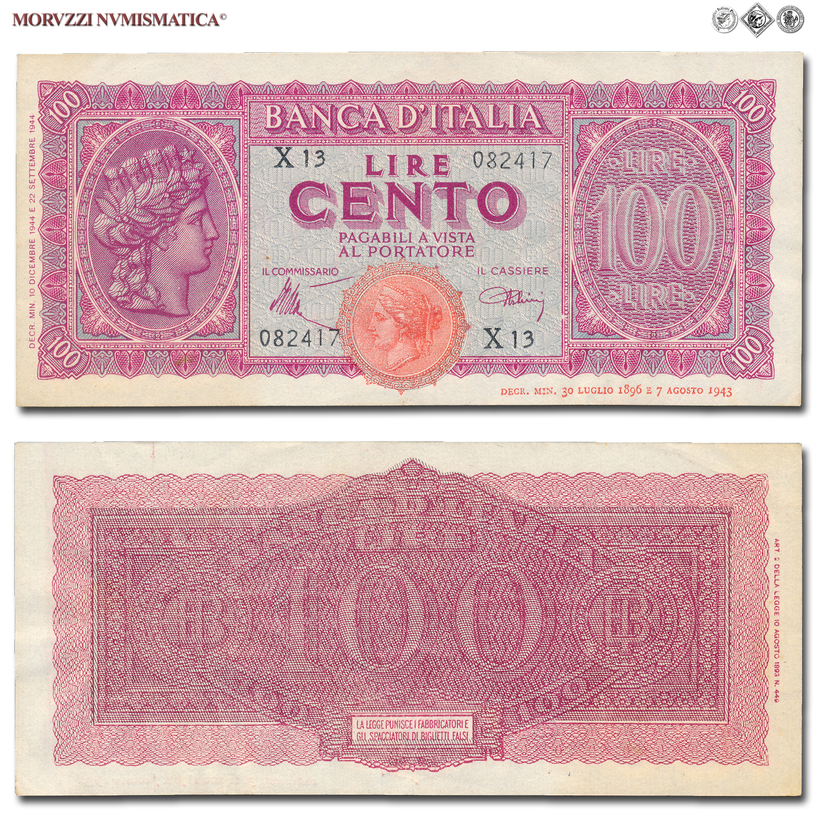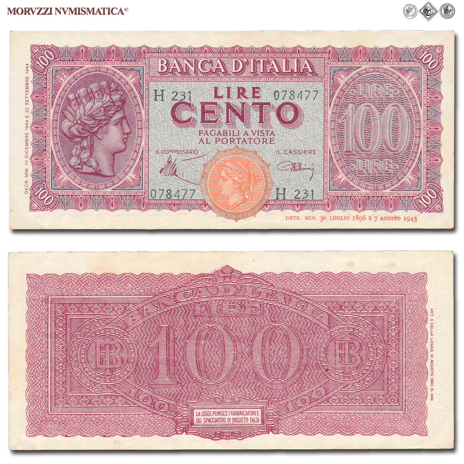 Luogotenenza, BANCA D'ITALIA, LIRE 100, Monogramma B.I., 10.10.1944