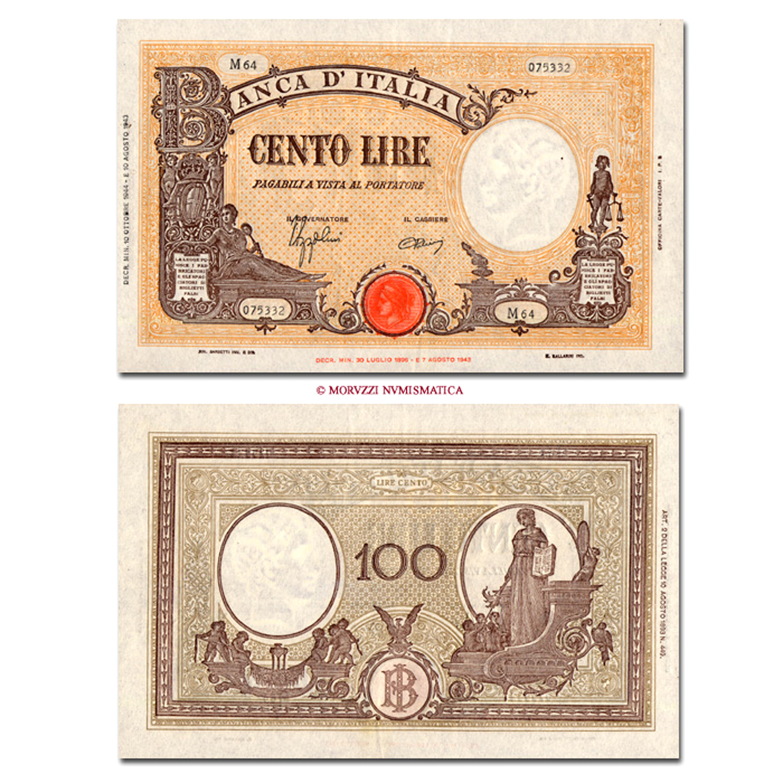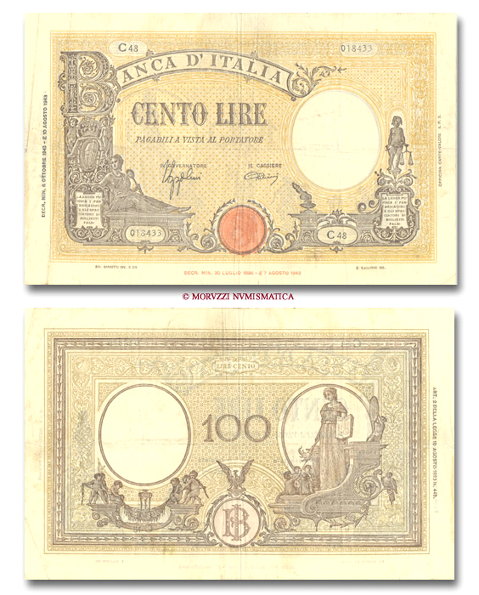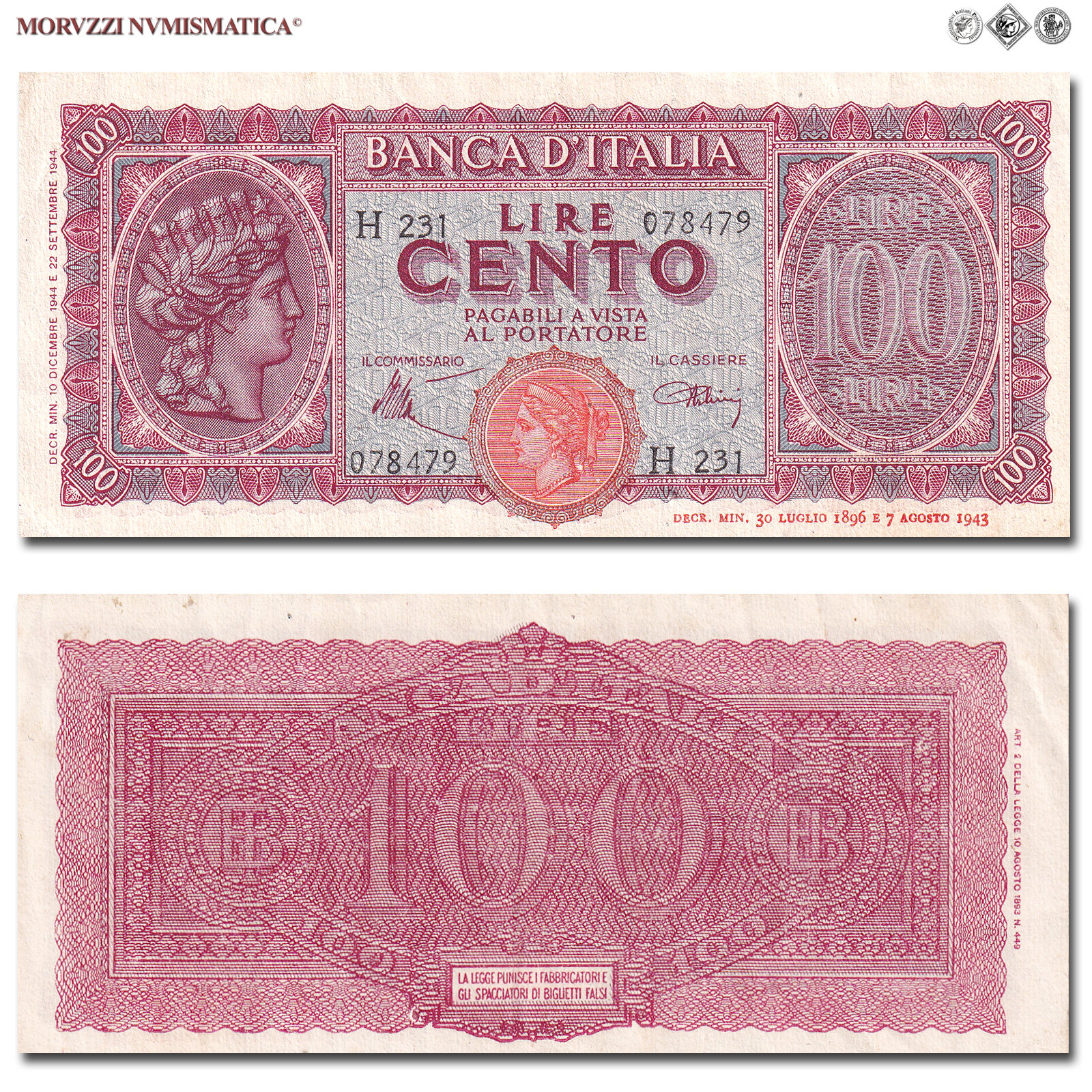 Luogotenenza, BANCA D'ITALIA, LIRE 100, Monogramma B.I., 10.10.1944
