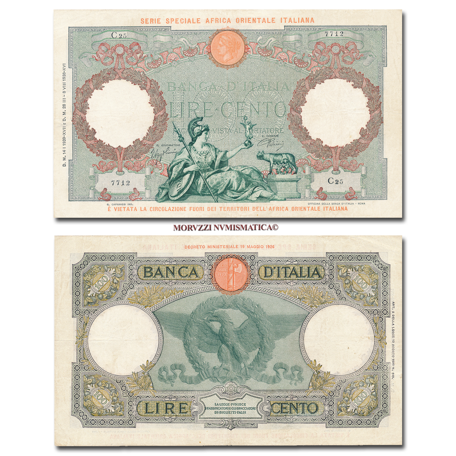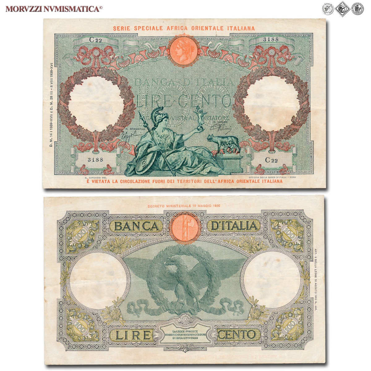 Regno d'Italia, Vittorio Emanuele III, Africa Orientale Italiana, BANCA D'ITALIA, 100 LIRE, 14.01.1939, Capranesi Aquila romana - testina / fascio, Firme: Azzolini, Urbini, mBB, (R), (Crapanzano OI 58) / banconote italiane (cartamoneta italiana)