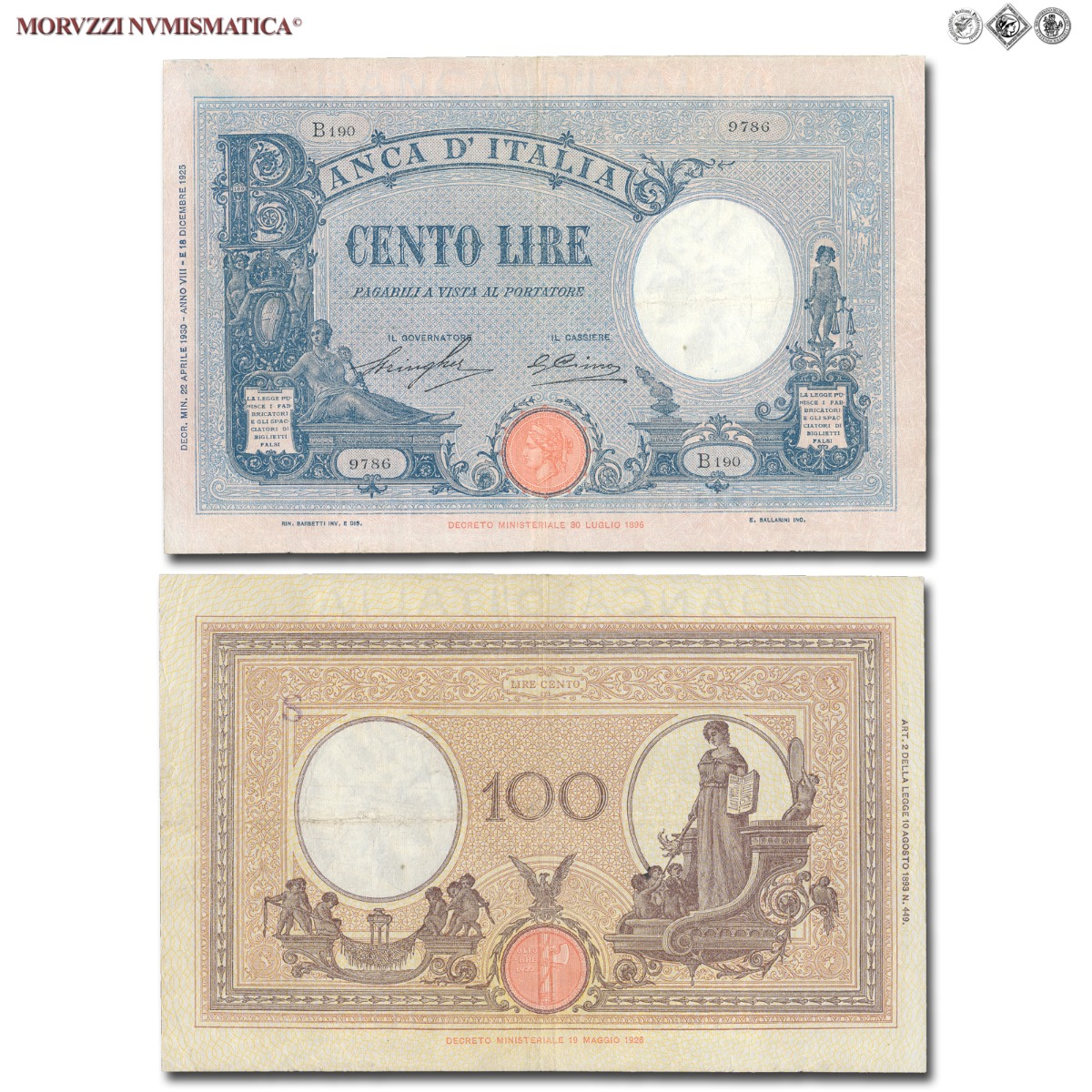 Regno d'Italia, Vittorio Emanuele III, BANCA D'ITALIA, 100 LIRE, 22.04.1930, Barbetti modificato azzurro - fascio (contrassegno di Stato: Testina d'Italia), Firme: Stringher, Cima, mBB, (R), (Crapanzano 214) banconote italiane rare (cartamoneta italiana)