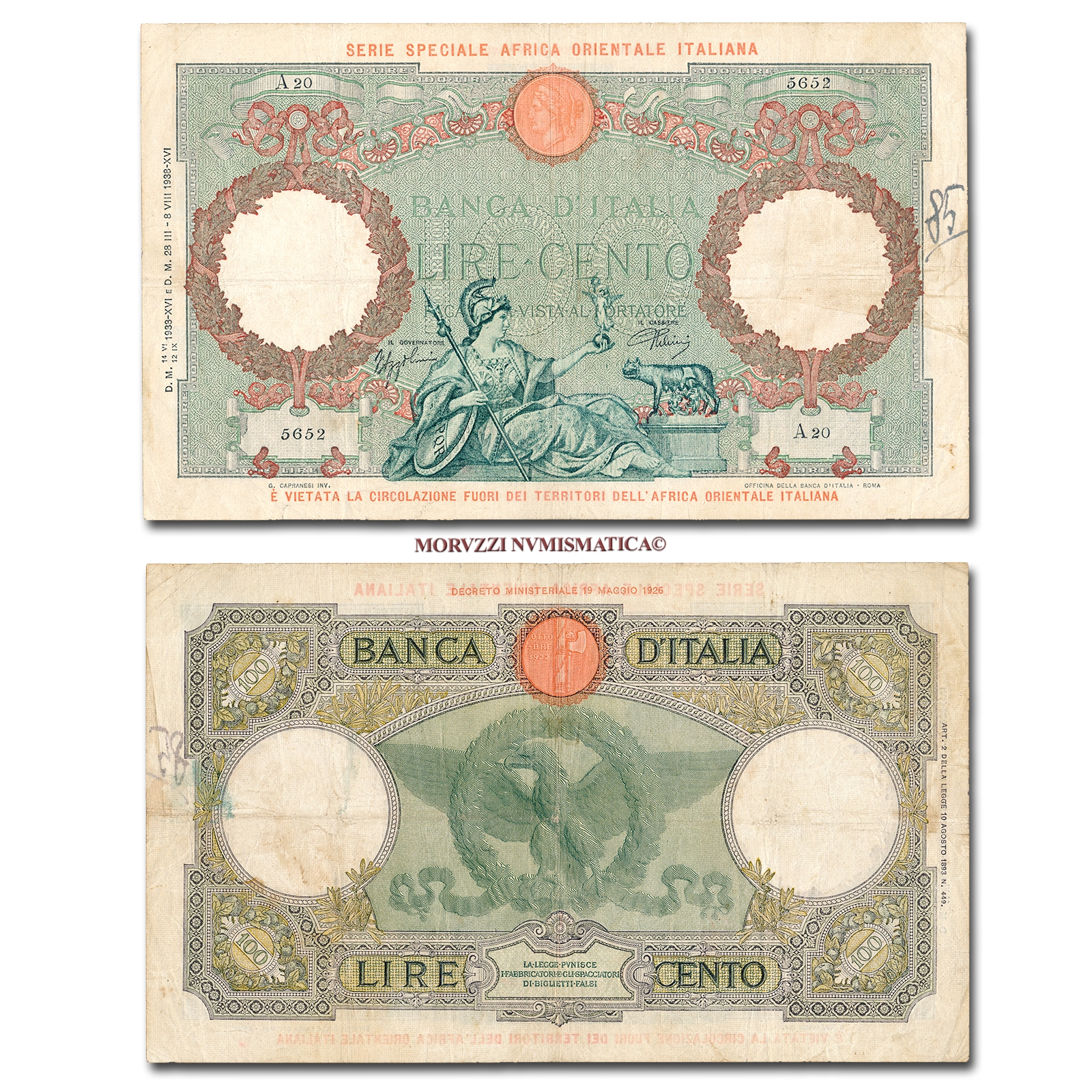 Regno d'Italia, Vittorio Emanuele III, Africa Orientale Italiana, BANCA D'ITALIA, 100 LIRE, 12.09.1938, Capranesi Aquila romana - testina / fascio, Firme: Azzolini, Urbini, qBB, (NC), (Crapanzano OI 57) / banconote italiane (cartamoneta italiana)