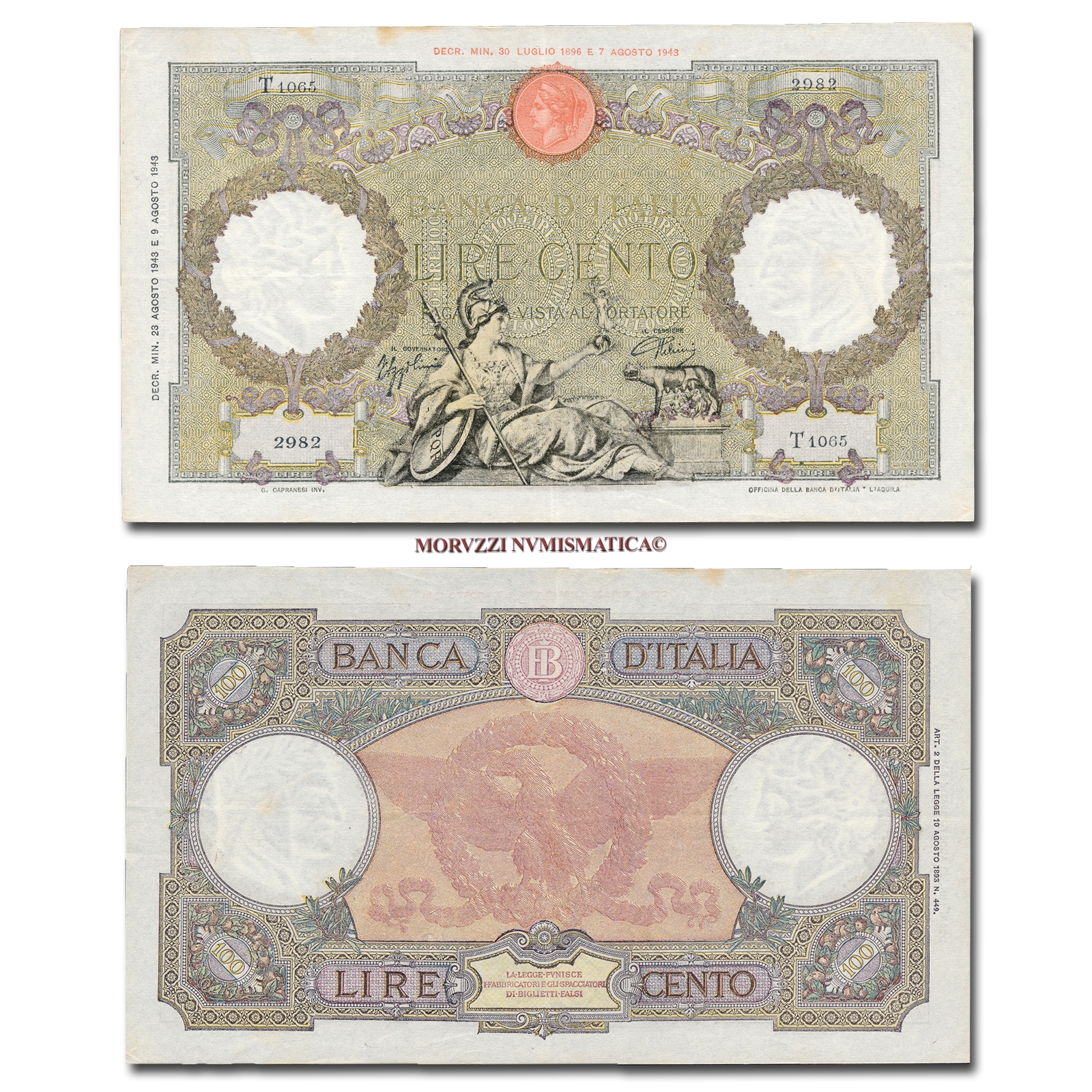 Regno d'Italia, Vittorio Emanuele III, BANCA D'ITALIA, 100 LIRE, 23.08.1943, Capranesi - Aquila romana (contrassegno di Stato: Testina d'Italia), Firme: Azzolini, Urbini, mBB, (R), (Crapanzano 259) / banconote italiane rare (cartamoneta italiana rara)