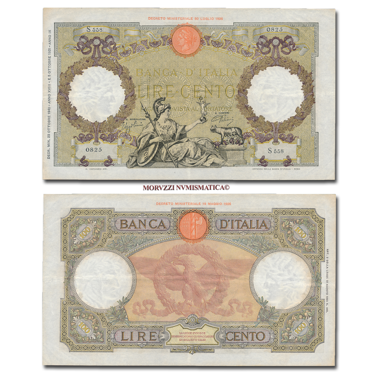 Regno d'Italia, Vittorio Emanule III, BANCA D'ITALIA, 100 LIRE, 23.10.1940, Capranesi - Aquila romana - fascio (contrassegno di Stato: Testina d'Italia), Firme: Azzolini, Urbini, mBB, (Crapanzano 248) banconote italiane (cartamoneta italiana - banconota)