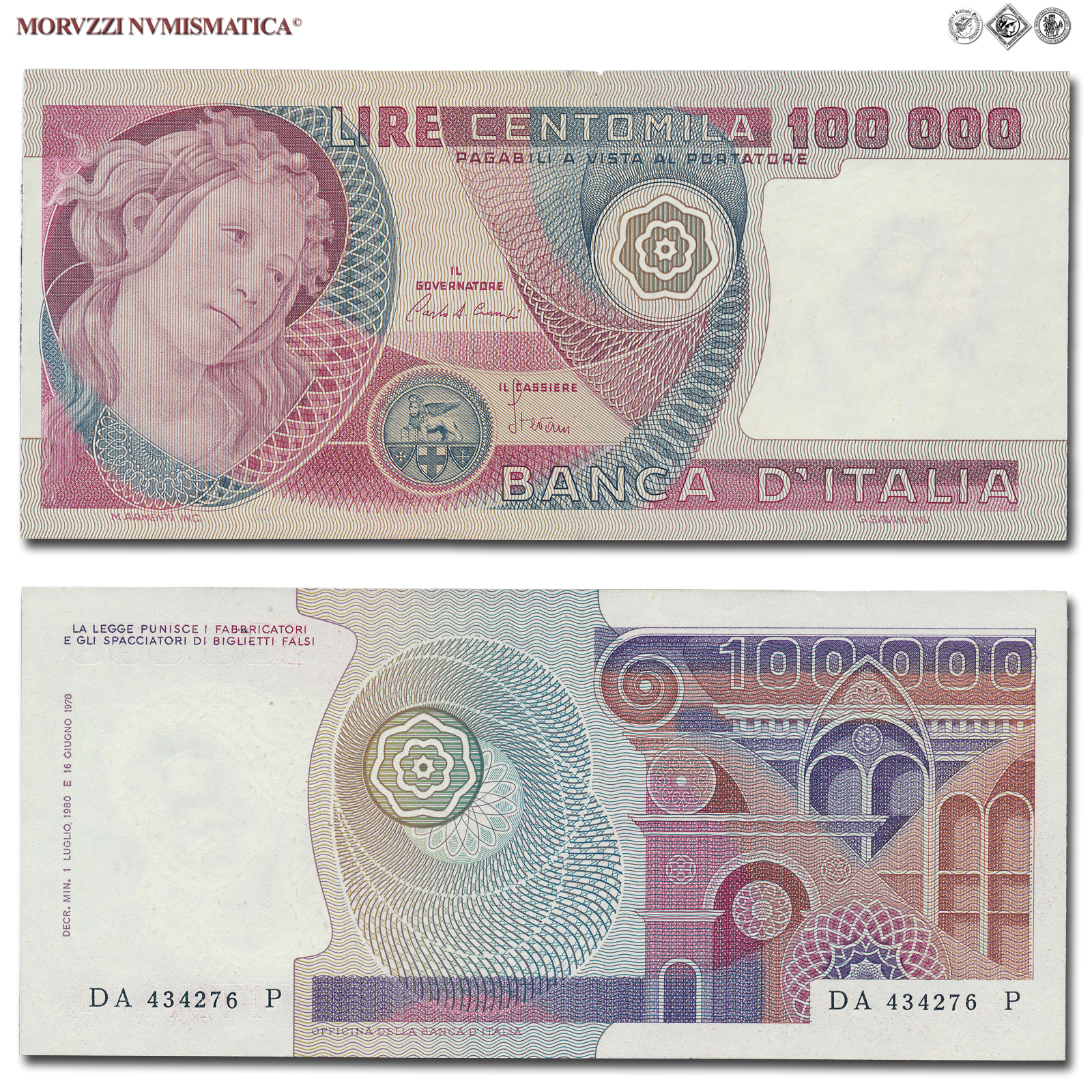 Repubblica Italiana, BANCA D'ITALIA, 100000 LIRE, 01.07.1980, Botticelli, Firme: Ciampi, Stevani, qFDS, (Crapanzano 618) / banconote italiane (cartamoneta italiana - biglietti da collezione - banconota da 100.000 lire)