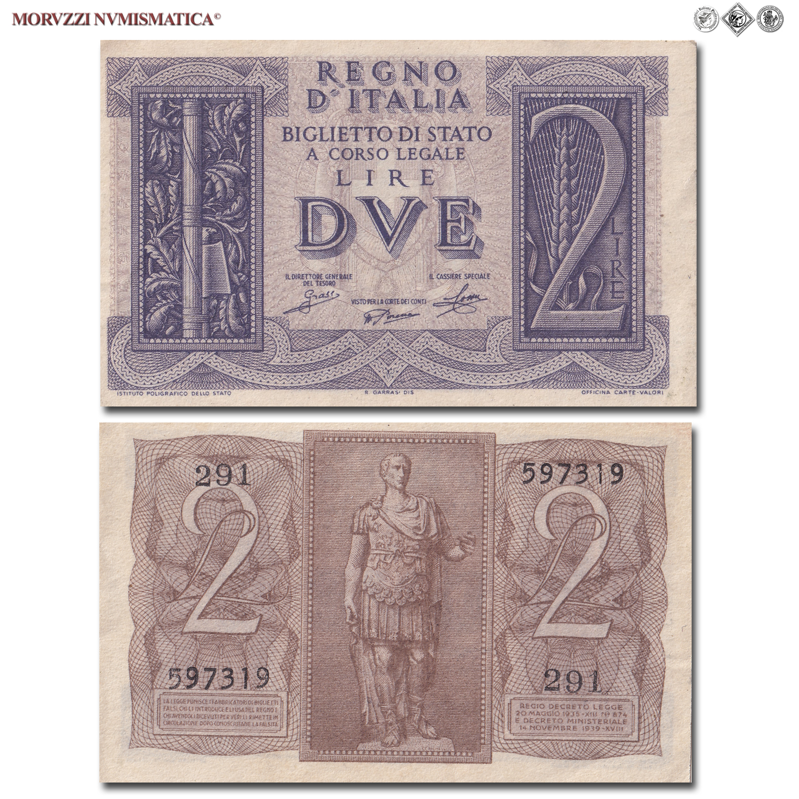Regno d'Italia, Vittorio Emanuele III, BIGLIETTO DI STATO, 2 LIRE, 14.11.1939, Impero - Giulio Cesare, Firme: Grassi, Porena, Cossu, mSPL, (Crapanzano BS14) / banconote italiane (cartamoneta italiana - biglietti da due lire)