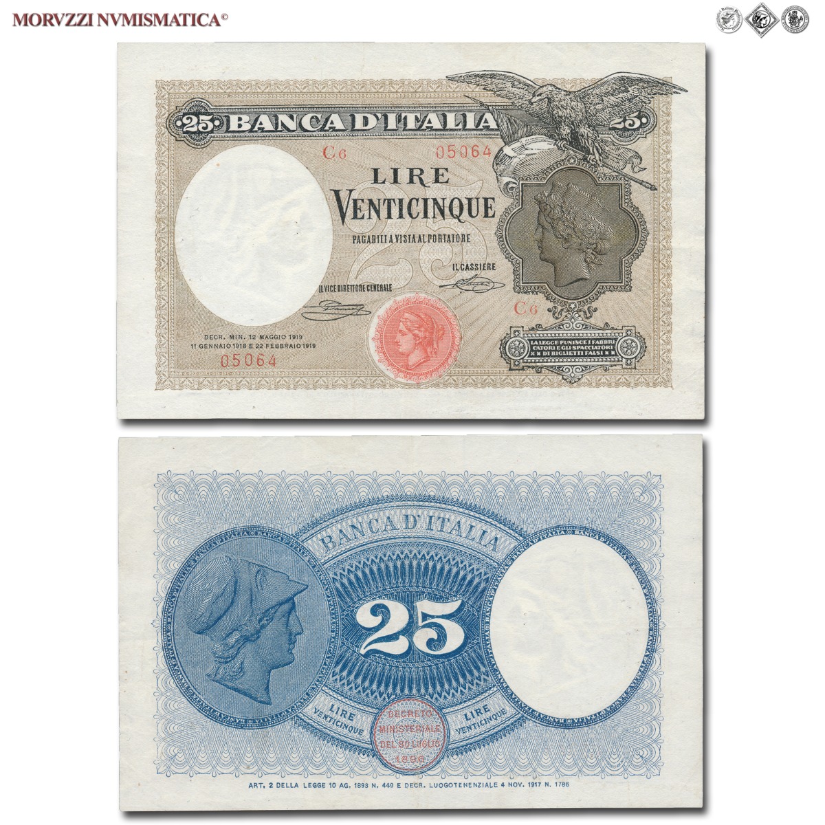 Regno d'Italia, Vittorio Emanuele III, BANCA D'ITALIA, 25 LIRE, Aquila Latina, 12.05.1919, Firme: Canovai, Sacchi, qSPL, (RR), (Crapanzano 4) / banconote italiane rare (cartamoneta italiana rara - biglietti da collezione - banconota da venticinque lire)