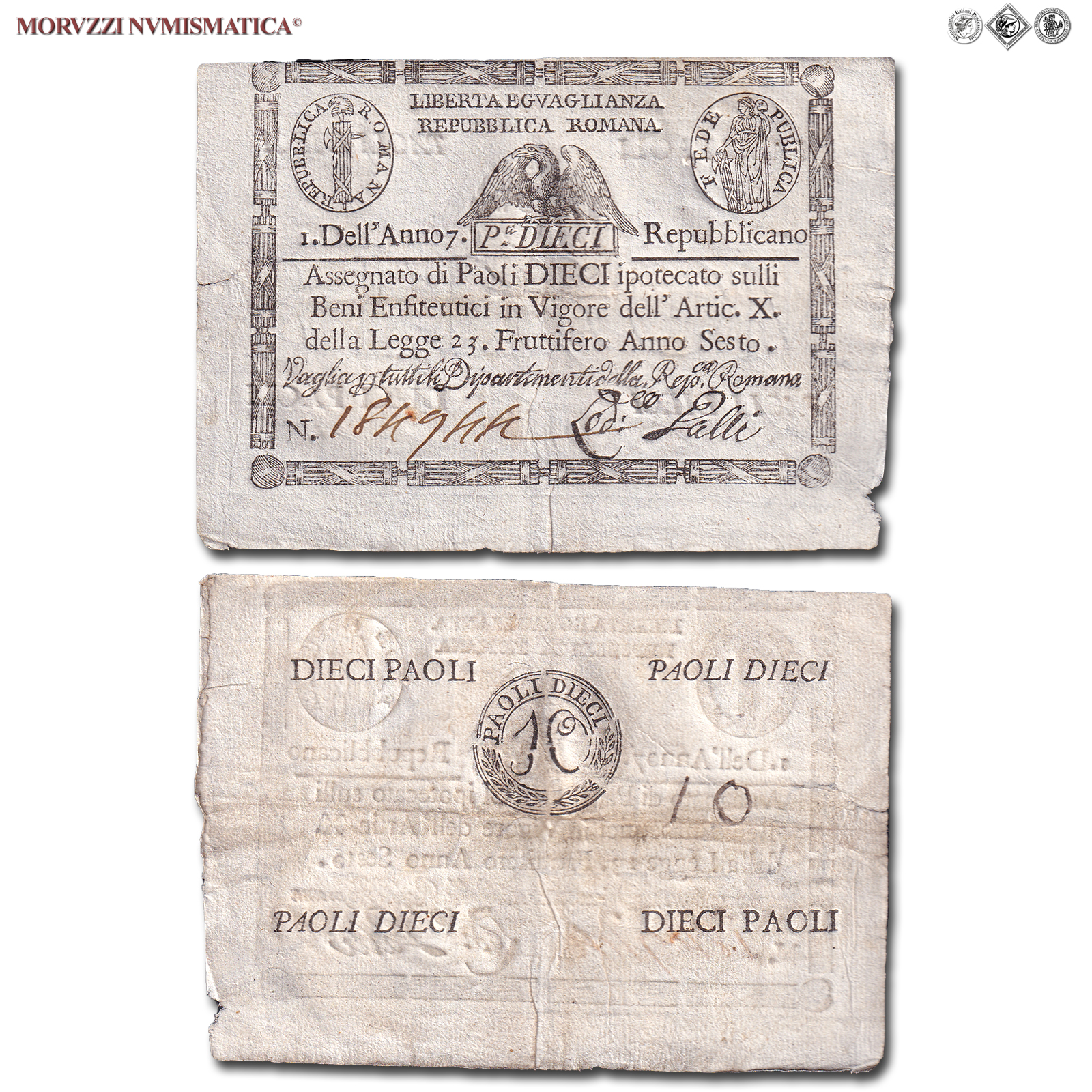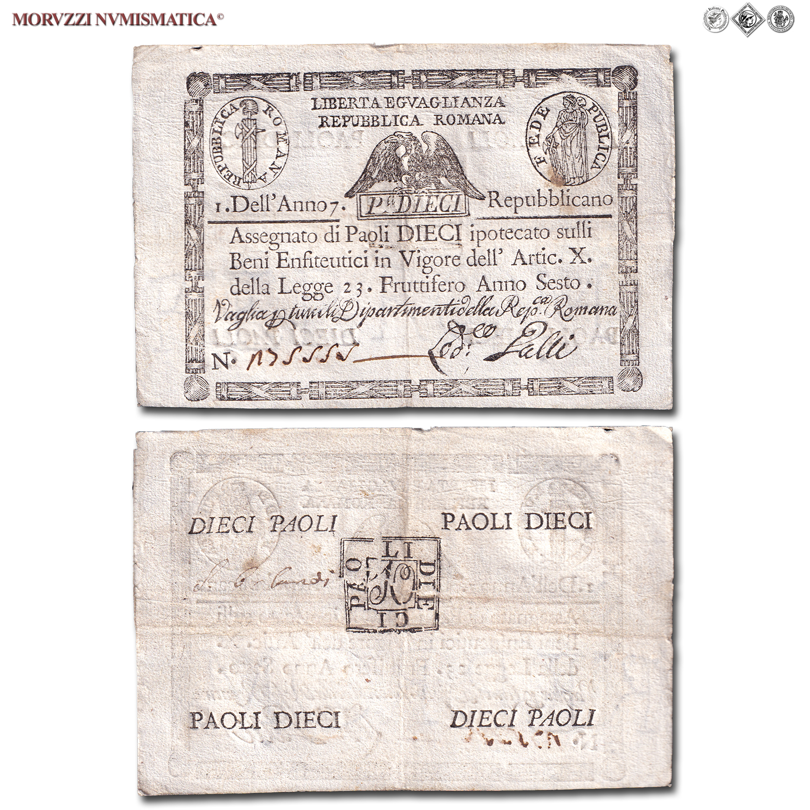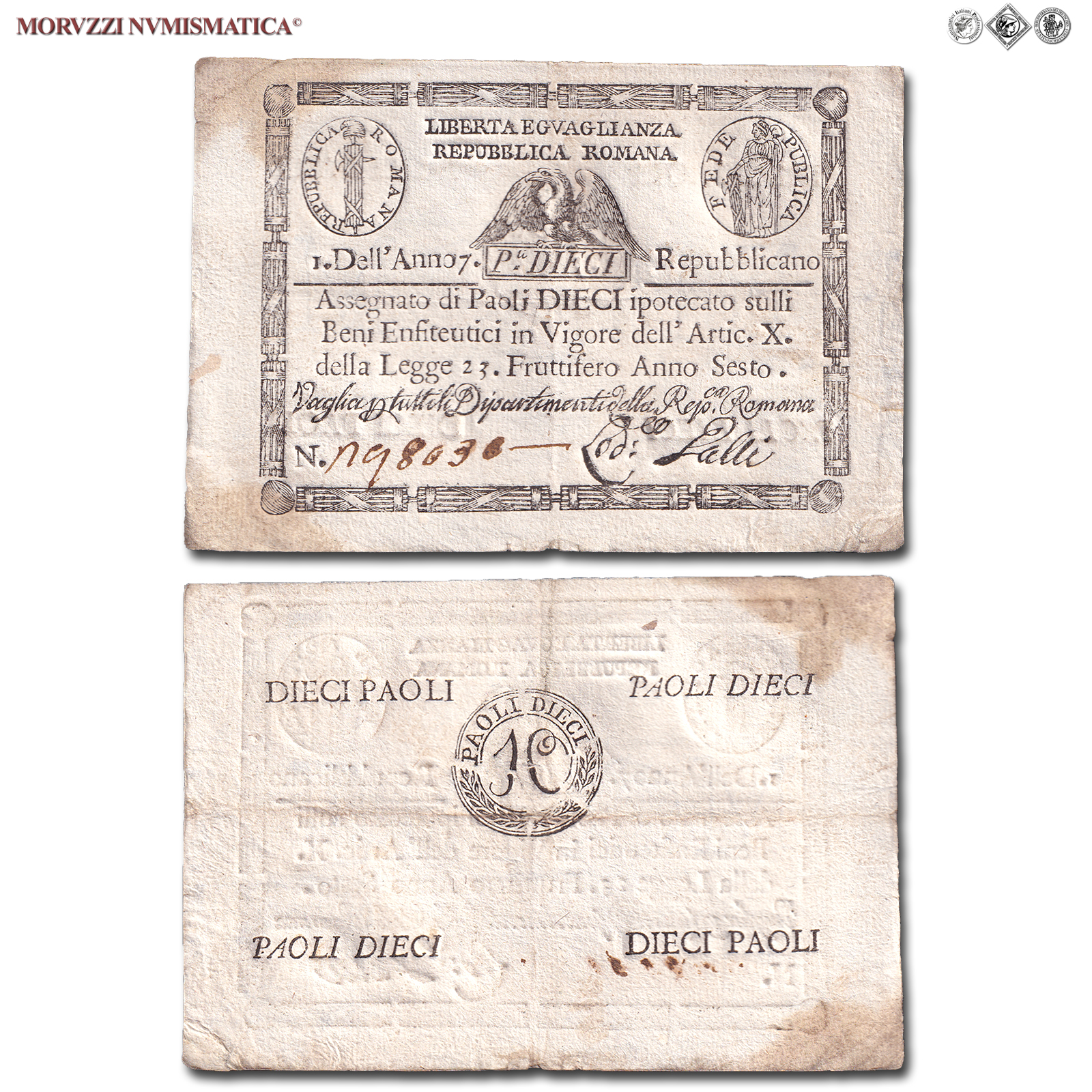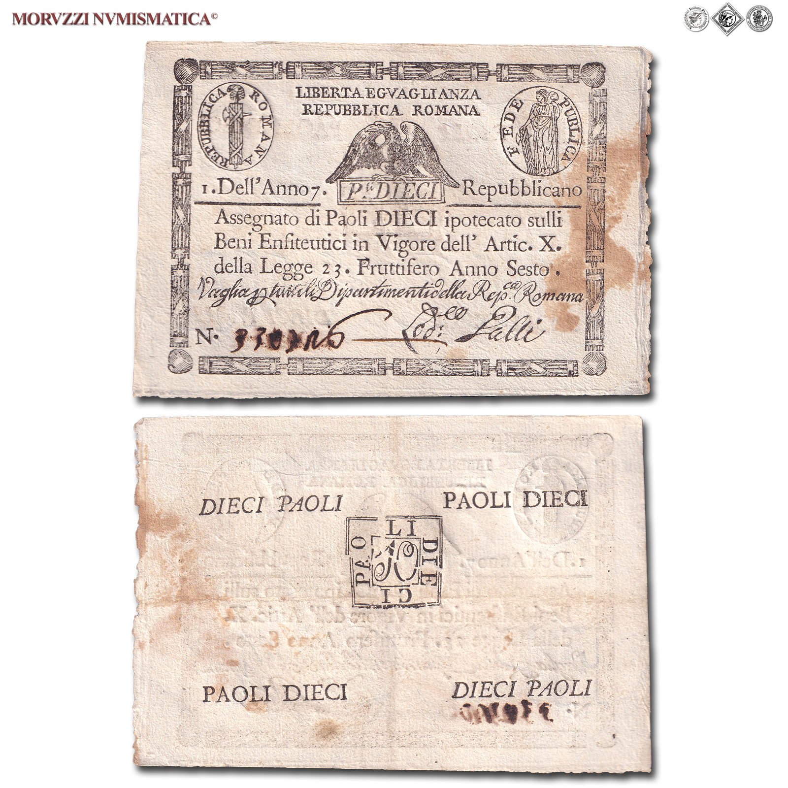 Prima Repubblica Romana, STATO PONTIFICIO, PAOLI 10, Bollo quadrato, dal 09.09.1798, Firme: Galli, BB, (Crapanzano As10) / banconote italiane preunitarie (banconota italiana preunitaria - cartamoneta da collezione - Stati Preunitari)