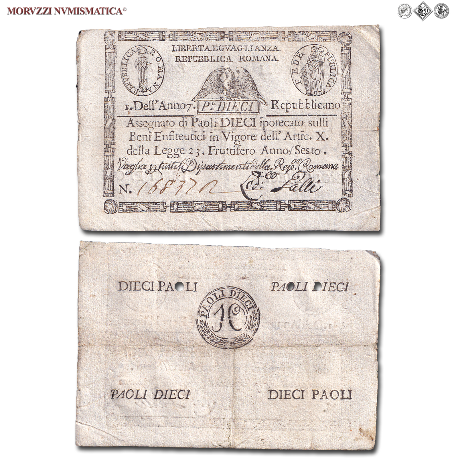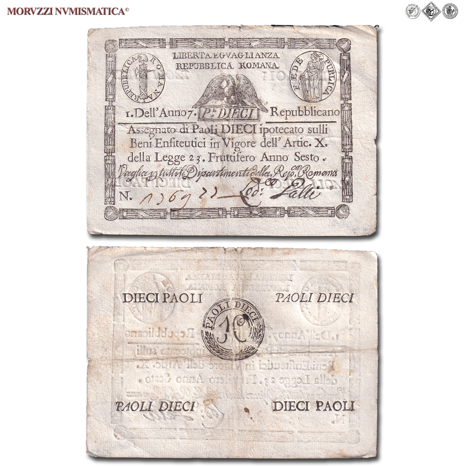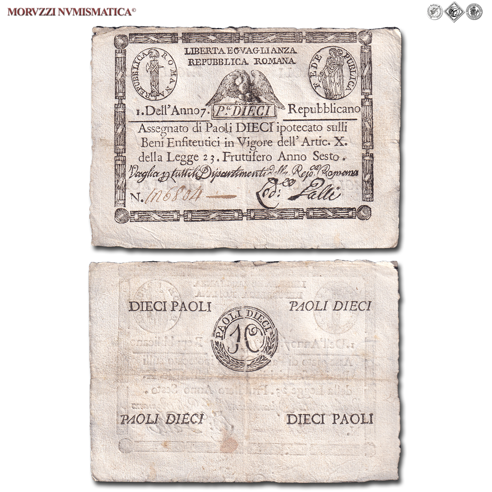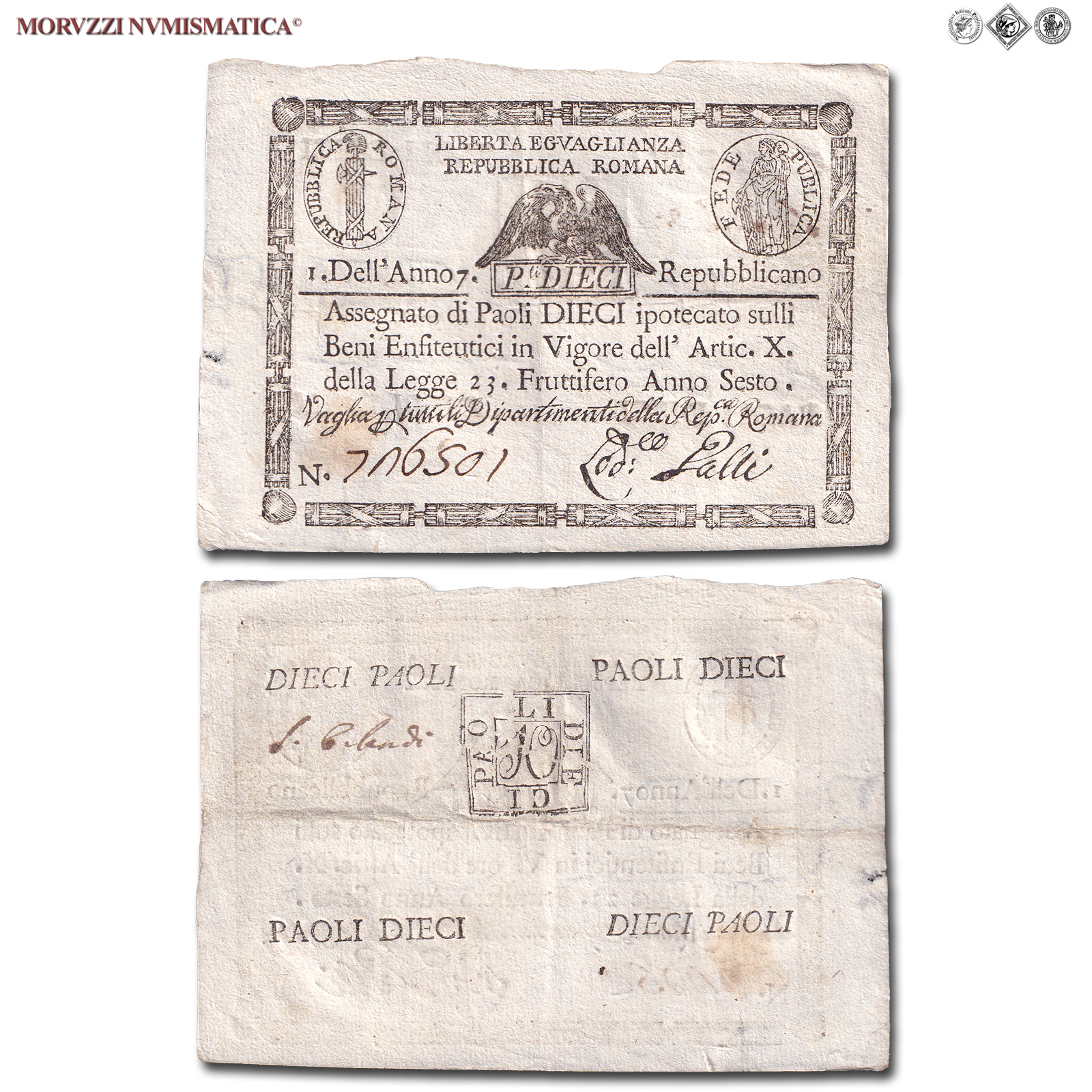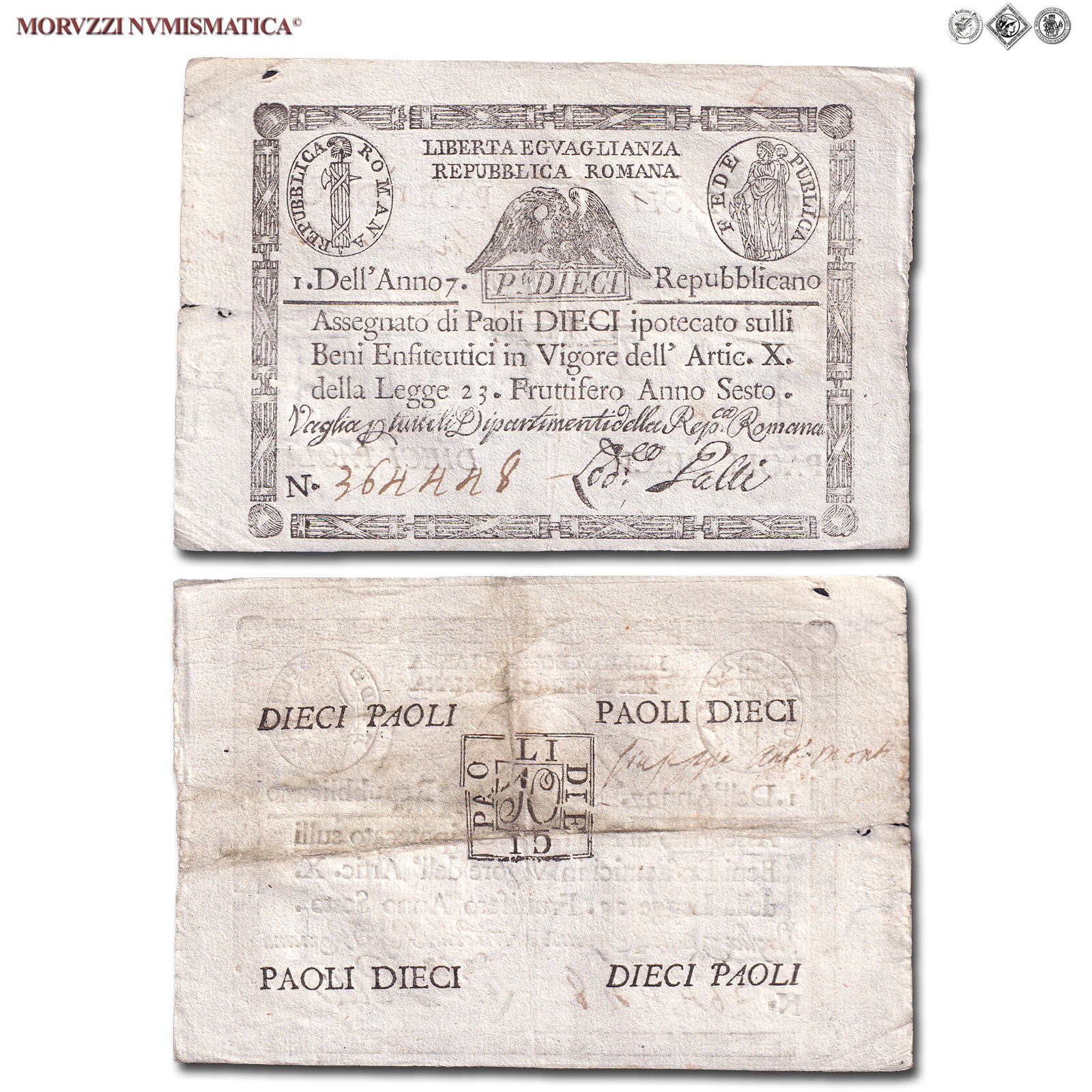 Prima Repubblica Romana, STATO PONTIFICIO, PAOLI 10, Bollo quadrato, dal 09.09.1798, Firme: Galli, BB, (Crapanzano As10) / banconote italiane preunitarie (banconota italiana preunitaria - cartamoneta da collezione - Stati Preunitari)