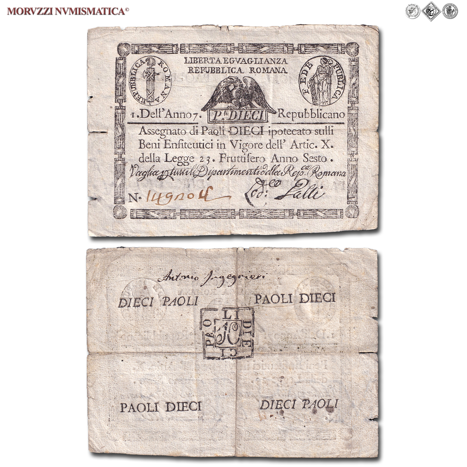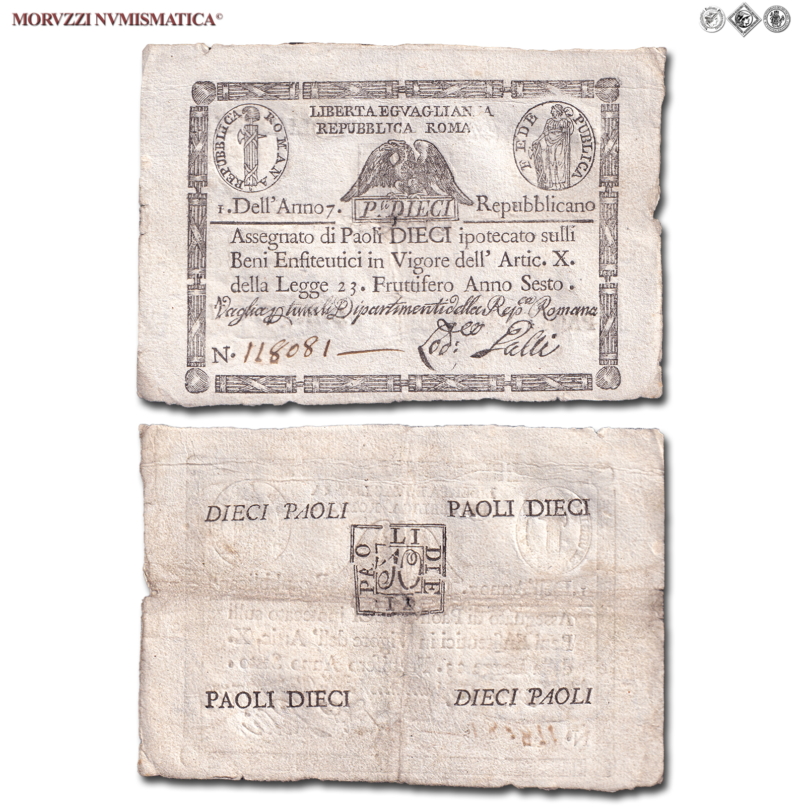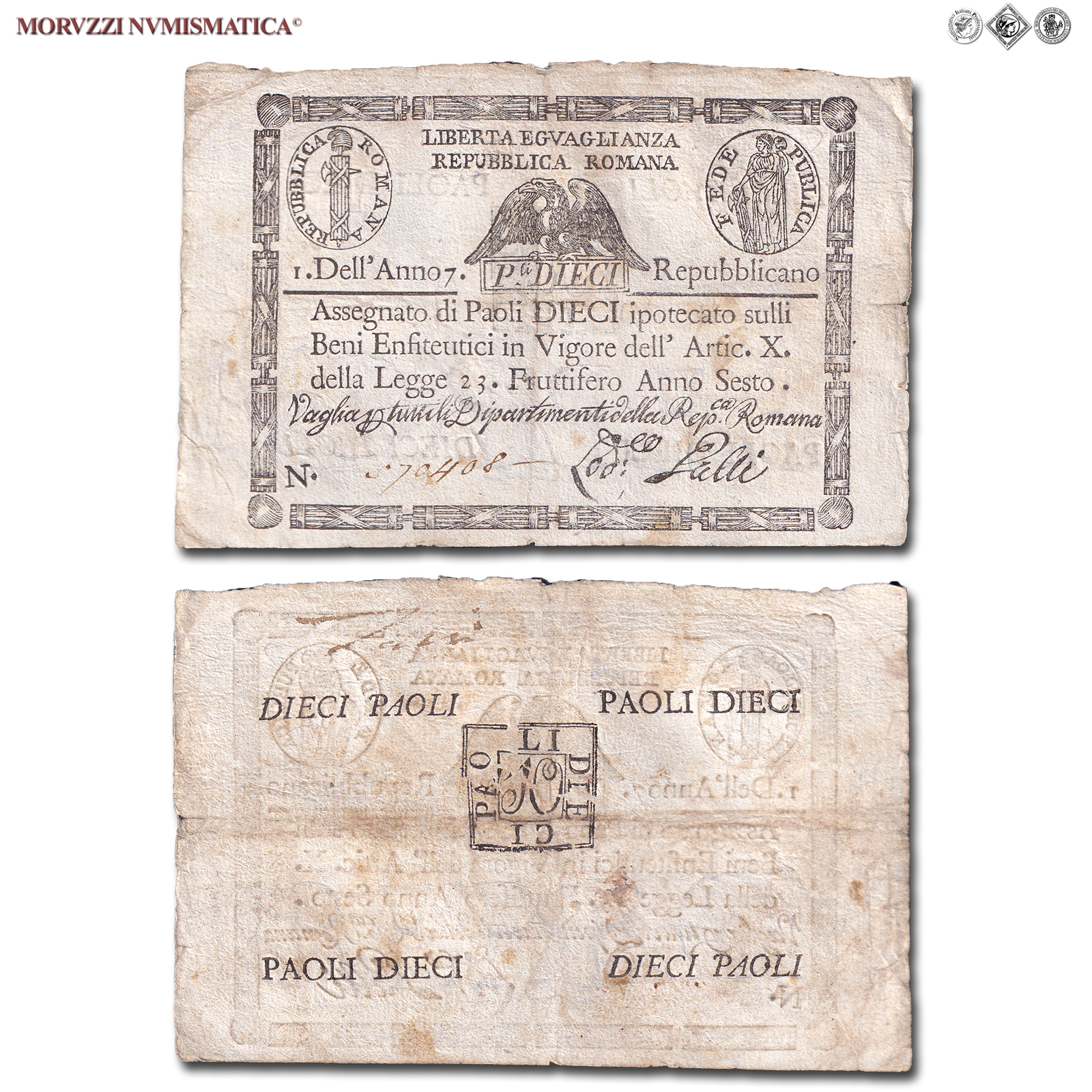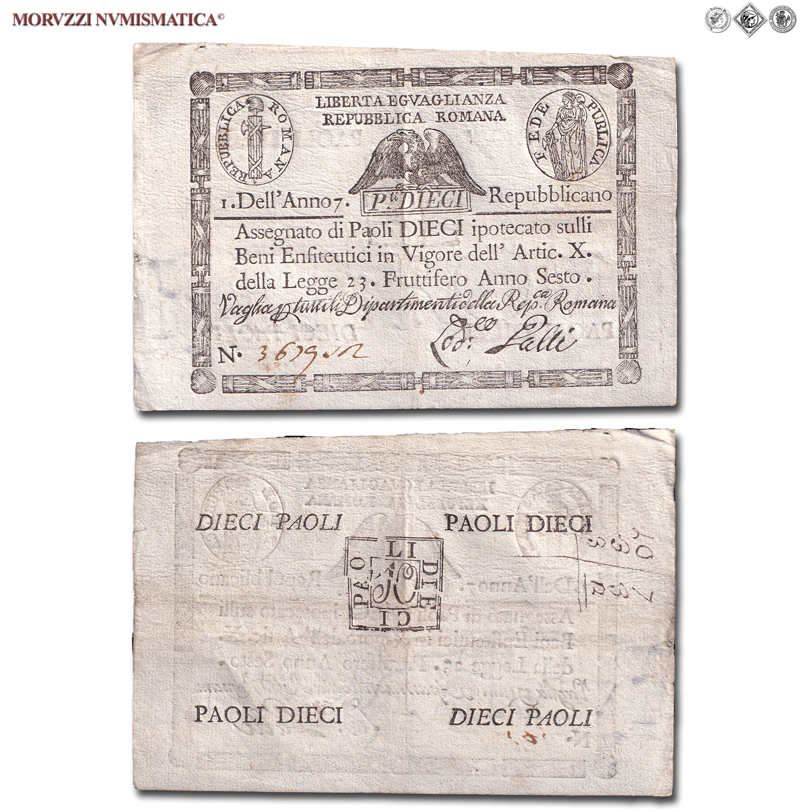 Prima Repubblica Romana, STATO PONTIFICIO, PAOLI 10, Bollo quadrato, dal 09.09.1798, Firme: Galli, BB, (Crapanzano As10) / banconote italiane preunitarie (banconota italiana preunitaria - cartamoneta da collezione - Stati Preunitari)