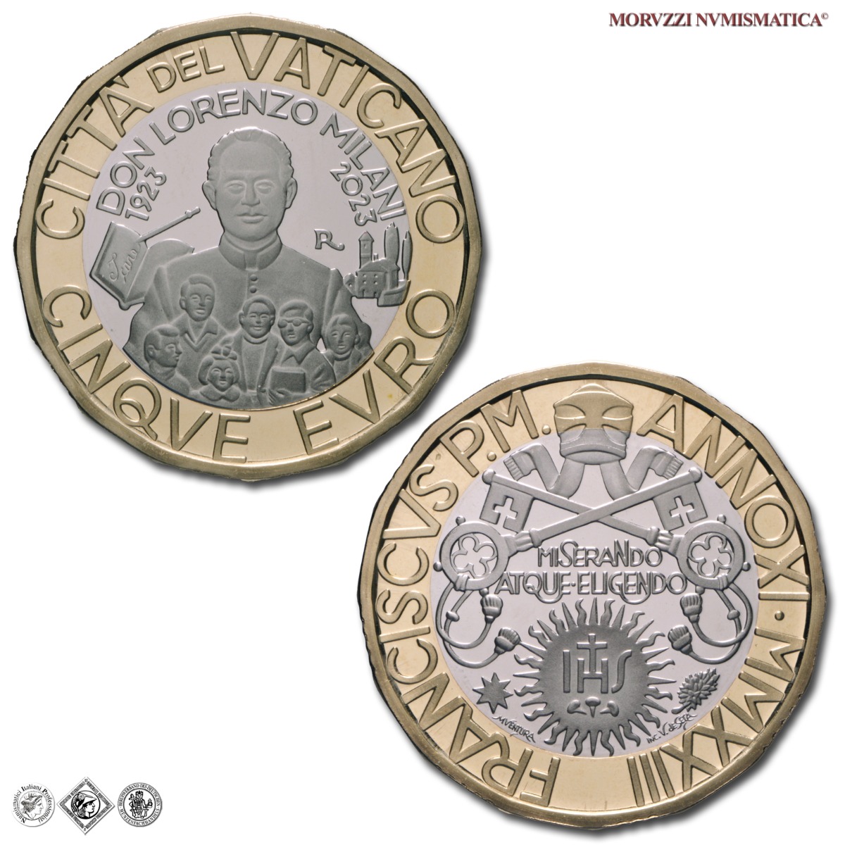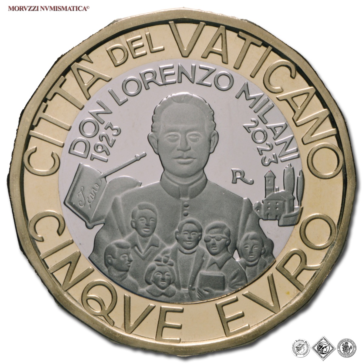 Città del Vaticano, 5 EURO BIMETALLICO 2023 FS, Centenario della nascita di don Lorenzo Milani / monete vaticane di Papa Francesco (5 EUROS PROOF - 5€ commemorative coins - "5 euro" commemorativi da collezione - moneta commemorativa)