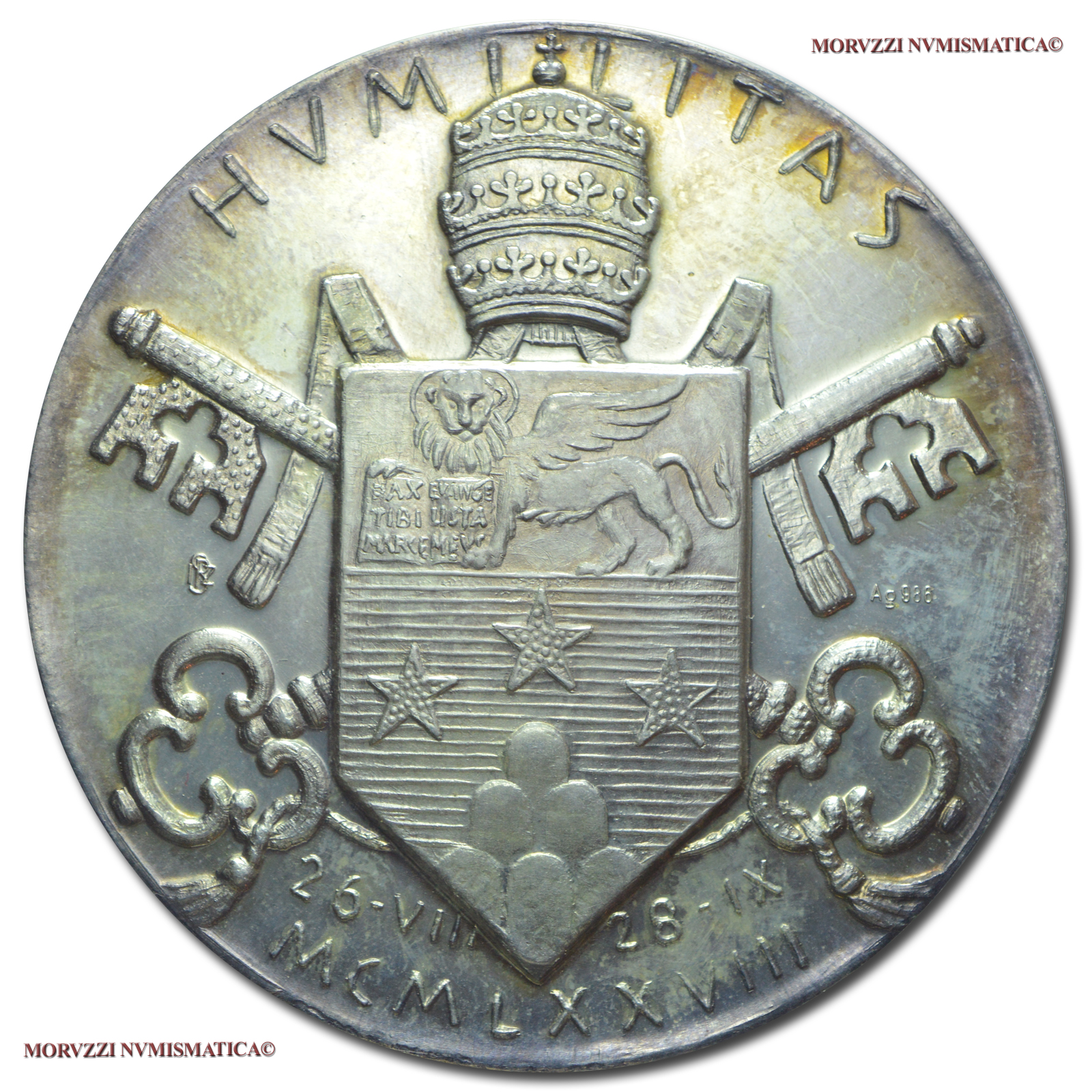 Città del Vaticano, GIOVANNI PAOLO I, Luciani, MEDAGLIA STRAORDINARIA IN ARGENTO, Commemorazione del Pontificato, Emissione: 1978 A I, D/ IOANNES PAVLVS I P • M •, busto con zucchetto e stola a s.; sul taglio spalla: il nome dell'autore (GIAMPAOLI), R/ HVMILITAS, stemma pontificio e date di elezione e di morte; in basso, su due righe: 25 - VIII 28 - IX / MCMLXXVIII, Opus Celestino Giampaoli, Rif. bibl. Macri-Marinelli, 725; Montenegro, 2; Unif., p. 504; Metallo: AR, gr. 40,34, (MP141986), Diam.: mm. 44,01, FDC