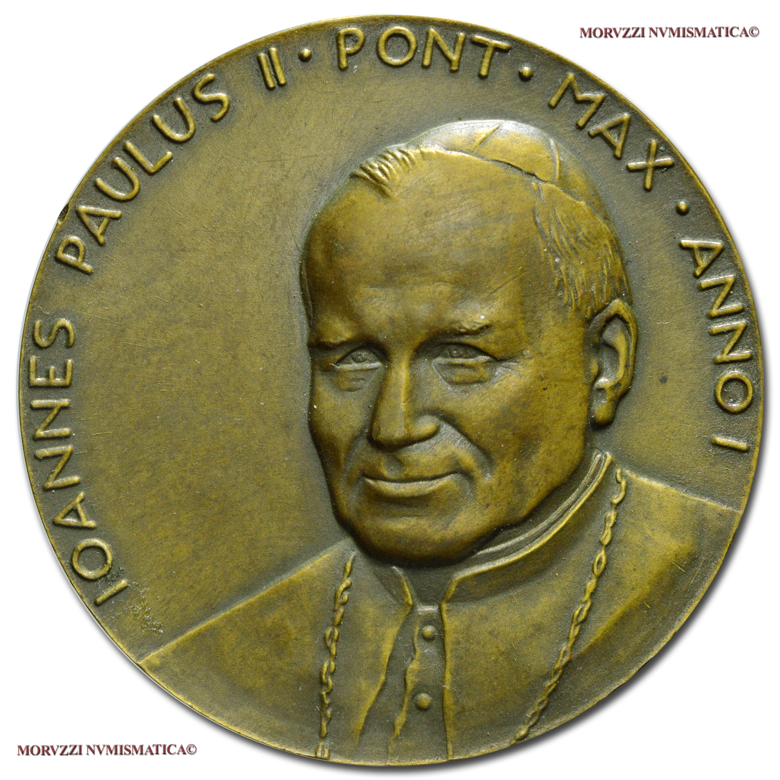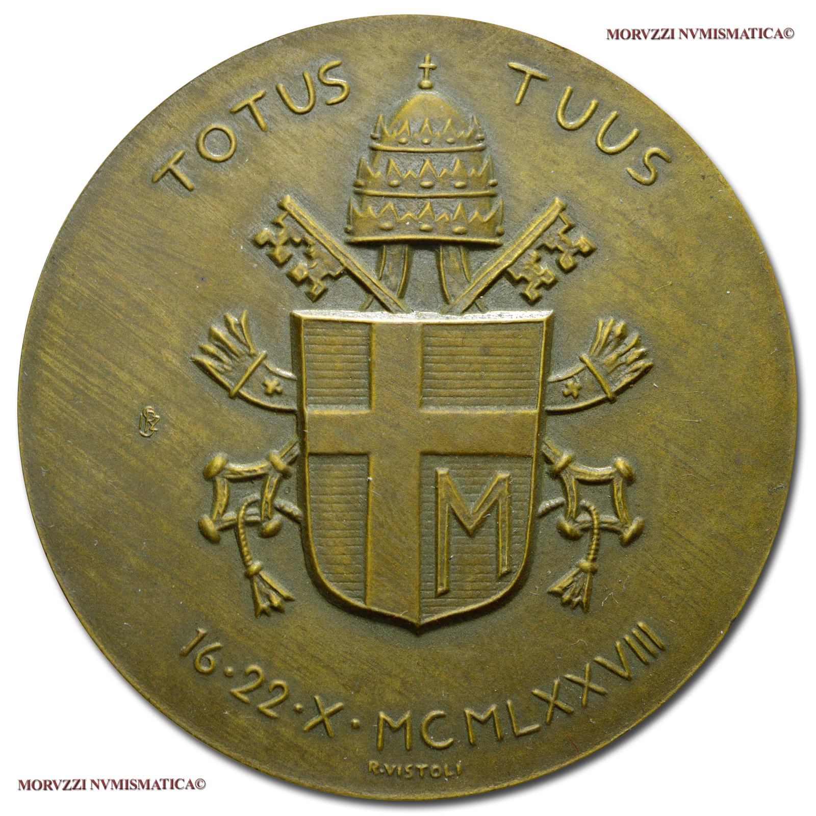 Città del Vaticano, GIOVANNI PAOLO II, Wojtyla, 1978-2005, MEDAGLIA ANNUALE IN BRONZO, Elezione al pontificato, Emissione: 1979 ANNO I, D/ IOANNES PAULUS II • PONT • MAX • ANNO I, busto del Pontefice di tre quarti a s., R/ TOTUS TUUS, stemma pontificio sormontato da tiara e chiavi; sotto: 16 • 22 • X • MCMLXXVIII; nel campo, a s.: IPZS; in basso: R • VISTOLI, Opus Raul Vistoli, Rif. bibl. Di Virgilio, 9; CRW, 0053; Metallo: AE, gr. 35,93, (MP141981), Diam.: mm. 43,83, FDC