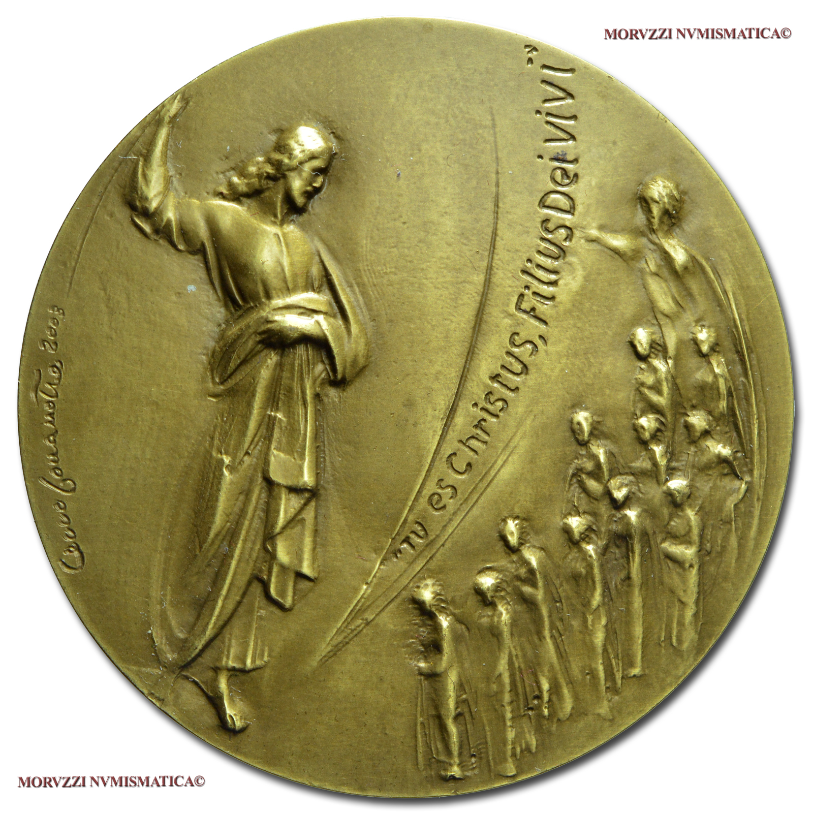 Città del Vaticano, GIOVANNI PAOLO II, Woytila, 1978-2005, MEDAGLIA ANNUALE IN BRONZO, Anno del Rosario, Emissione: 2003 ANNO XXV, D/ IOANNES PAVLVS PP. II ANNO XXV PONTIFICATUS, busto orante a s., di fronte alla Madonna con bambino; sotto incuso : IPZS, R/ Cristo in piedi a s., rivolto verso destra ai dodici apostoli; al centro, nel campo: TU ES CHRISTUS, FILIUS DEI VIVI; presso il bordo in corsivo a s.: CECCO BONANOTTE 2003, Opus Cecco Bonanotte, Rif. bibl. Di Virgilio, 329; Metallo: AE, gr. 36,24, (MP120607), Diam.: mm. 44,04, FDC