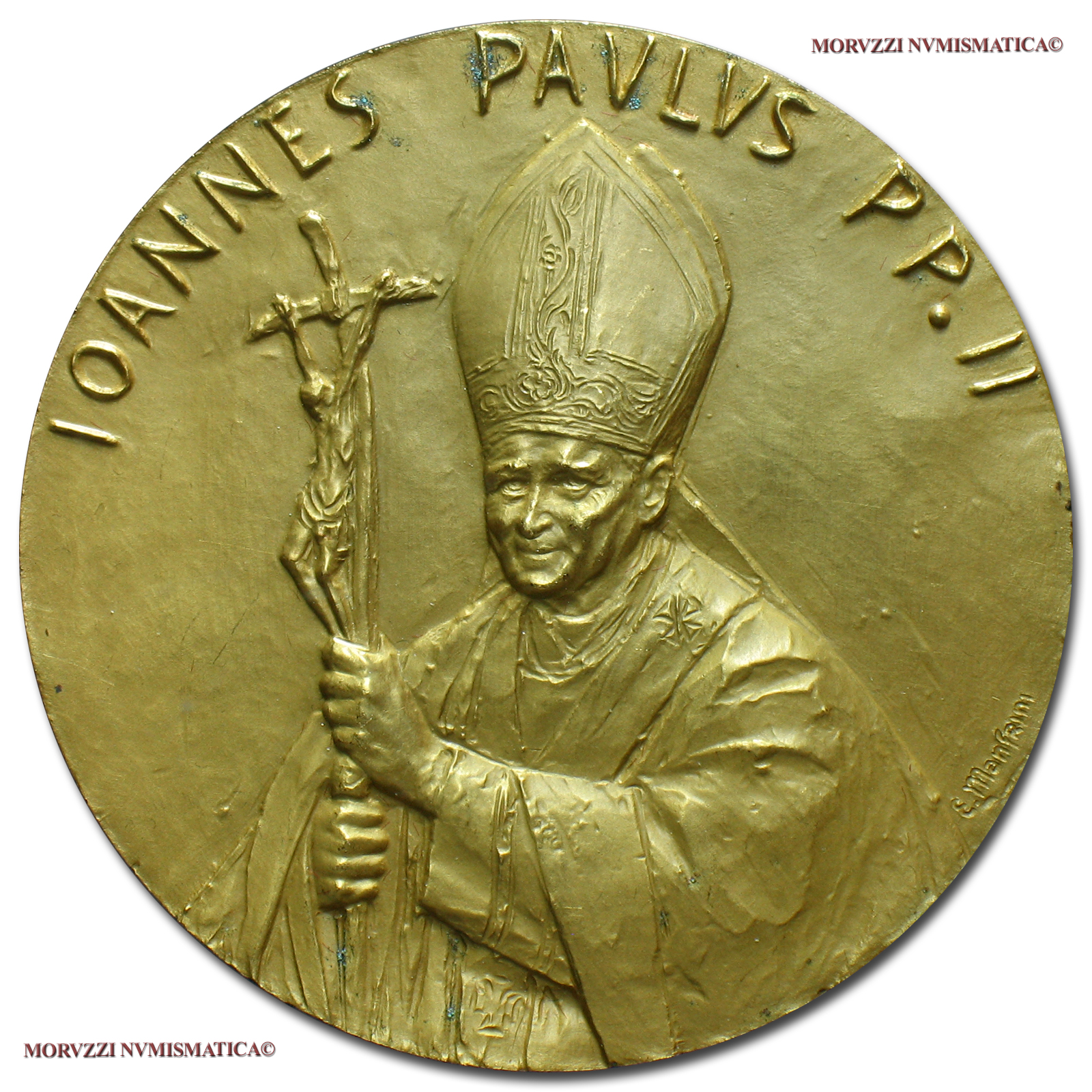 Città del Vaticano, GIOVANNI PAOLO II, Wojtyla, 1978-2005, MEDAGLIA IN BRONZO DORATO, Sinodo Speciale per l'America, Emissione: 1997, D/ IOANNES PAVLVS PP. II, busto di 3/4 a s. con mitra, pianeta e pallio, regge pastorale; in basso, a d.: E. MANFRINI, R/ SYNODUS EPISCOPORUM PRO AMERICA, Dio Padre raggiante e benedicente di fronte, regge globo; in basso: S. JOHNSON, Opus Enrico Manfrini (Stabilimento Stefano Johnson di Milano), Metallo: AE dorato, gr. 43,87, (MP132225), Diam.: mm. 49,93, FDC