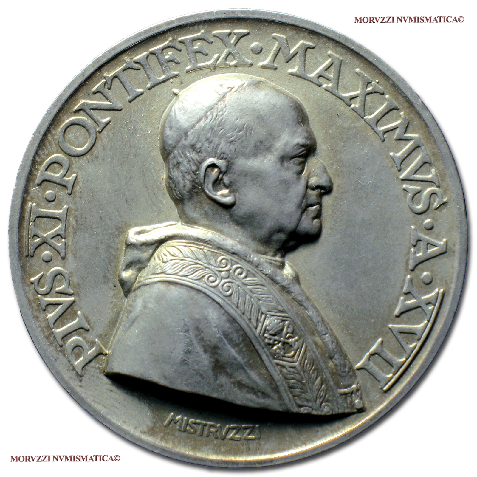 Città del Vaticano, PIO XI, Ratti, 1922-1939, MEDAGLIA ANNUALE IN ARGENTO, Il nuovo Ateneo Lateranense, Emissione: 1938 A XVII, D/ PIVS • XI • PONTIFEX • MAXIMVS • A • XVII, busto con berretto, mozzetta e stola a d.; MISTRVZZI sotto, R/ AN • CD • A • NAT • S • CAROLI • BORROMAEI, prospetto del nuovo Ateneo; ATHENAEVM • LATERAN • / A • FVNDAMENTIS / EXCITATVM in esergo, Opus Mistruzzi, Rif. bibl. Bart., E938; Metallo: AR, gr. 38,91, (MP55324), Diam.: mm. 44,40, FDC