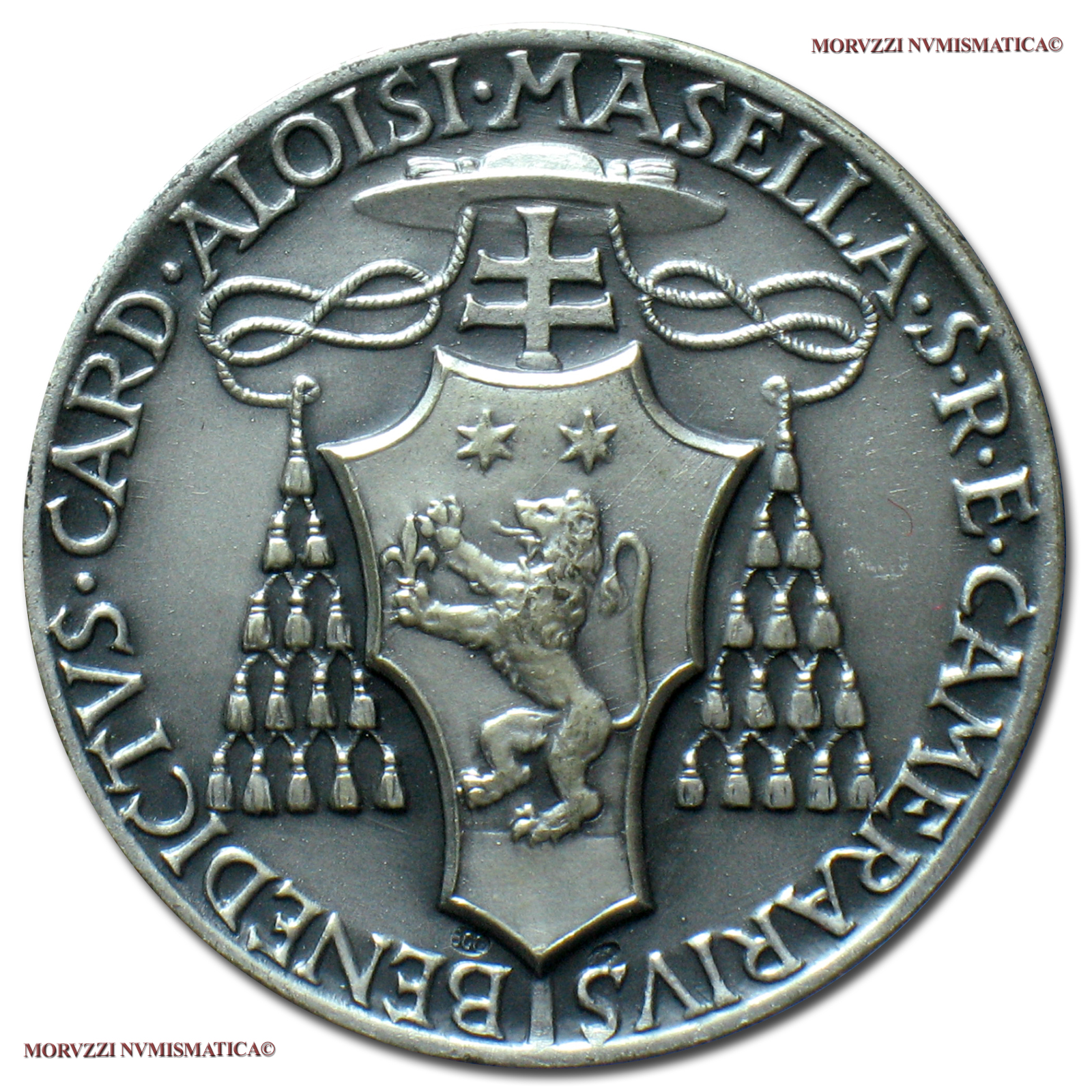 Città del Vaticano, SEDE VACANTE, 1963, MEDAGLIA IN ARGENTO, Camerlengo Cardinale Benedetto Aloisi Masella, Emissione: 1963, D/ BENEDICTVS • CARD • ALOISI • MASELLA • S • R • E • CAMERARIVS, stemma del Cardinale Aloisi-Masella sormontato da croce e galero a quindici nodi, R/ SEDE • VACANTE • MCMLXIII, padiglione su chiavi decussate; sotto, a d.: SAVELLI, Opus Aurelio Mistruzzi per la ditta Savelli di Roma, Rif. bibl. Boccia, 124; Metallo: AR, gr. 27,25, (MP120585), Diam.: mm. 37,65, FDC, (NC)
