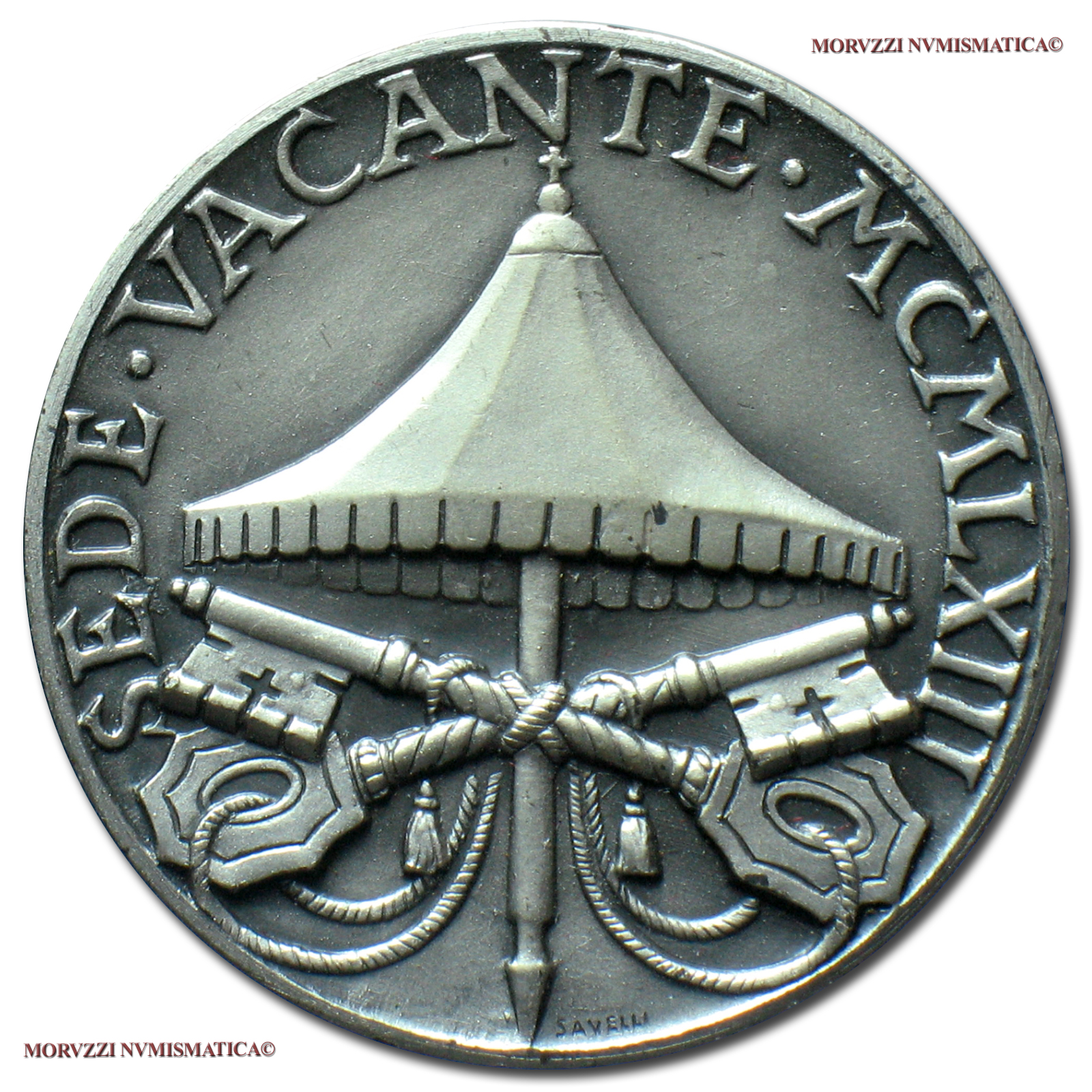Medaglia coniata, emessa per la Sede Vacante del 1963, con fondo opaco, dallo Stabilimento Bertoni di Milano, dal Cardinale Camerlengo del Conclave Benedetto Aloisi Masella (1879-1970). Committenza: Santa Sede a mezzo della Ditta Savelli di Roma.