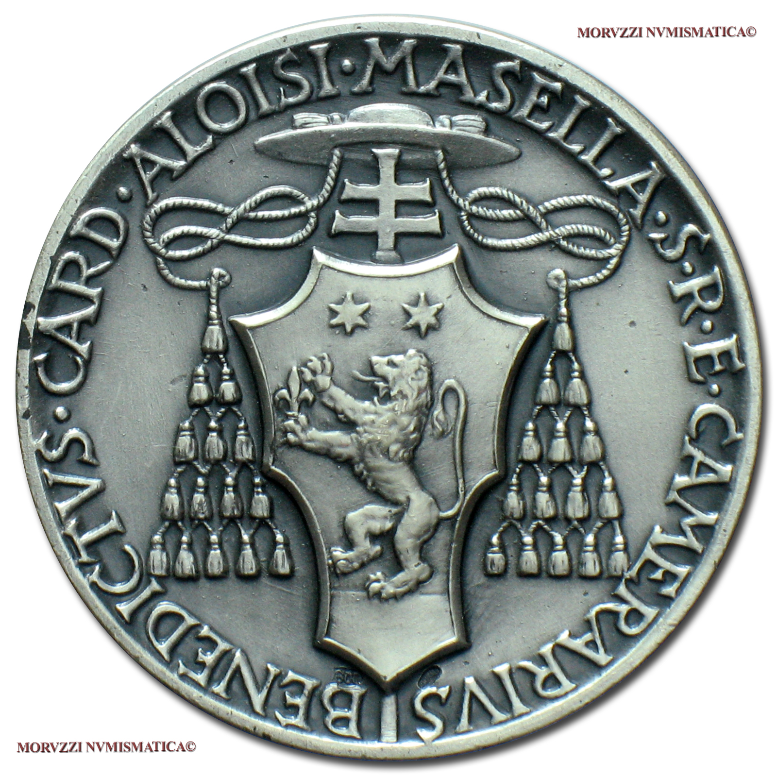 Città del Vaticano, SEDE VACANTE, 1963, MEDAGLIA IN ARGENTO, Camerlengo Cardinale Benedetto Aloisi Masella, Emissione: 1963, D/ BENEDICTVS • CARD • ALOISI • MASELLA • S • R • E • CAMERARIVS, stemma del Cardinale Aloisi-Masella sormontato da croce e galero a quindici nodi, R/ SEDE • VACANTE • MCMLXIII, padiglione su chiavi decussate; sotto, a d.: SAVELLI, Opus Aurelio Mistruzzi per la ditta Savelli di Roma, Rif. bibl. Boccia, 124; Metallo: AR, gr. 27,59, (MP120584), Diam.: mm. 37,70, FDC, (NC)