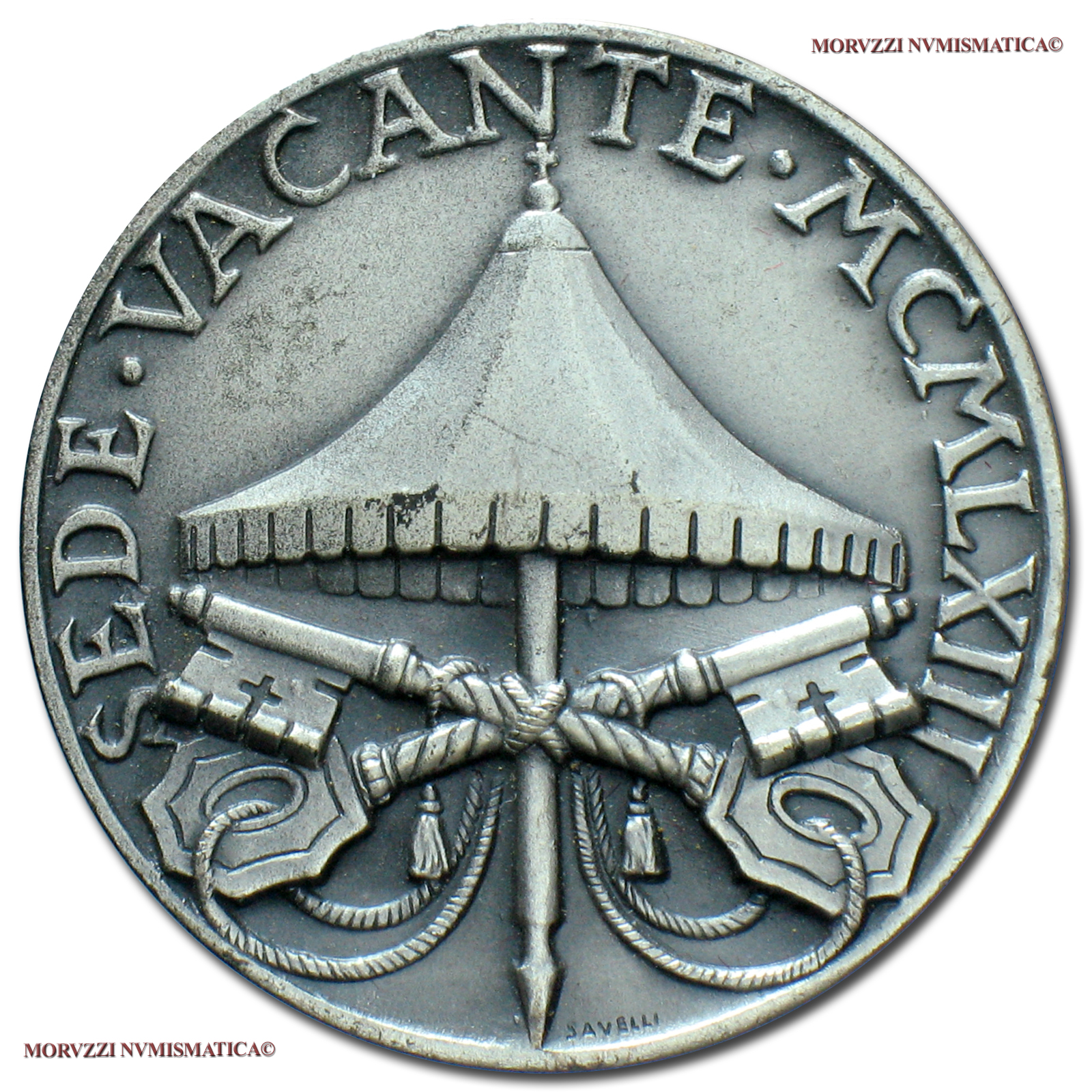 Medaglia coniata, emessa per la Sede Vacante del 1963, con fondo opaco, dallo Stabilimento Bertoni di Milano, dal Cardinale Camerlengo del Conclave Benedetto Aloisi Masella (1879-1970). Committenza: Santa Sede a mezzo della Ditta Savelli di Roma.