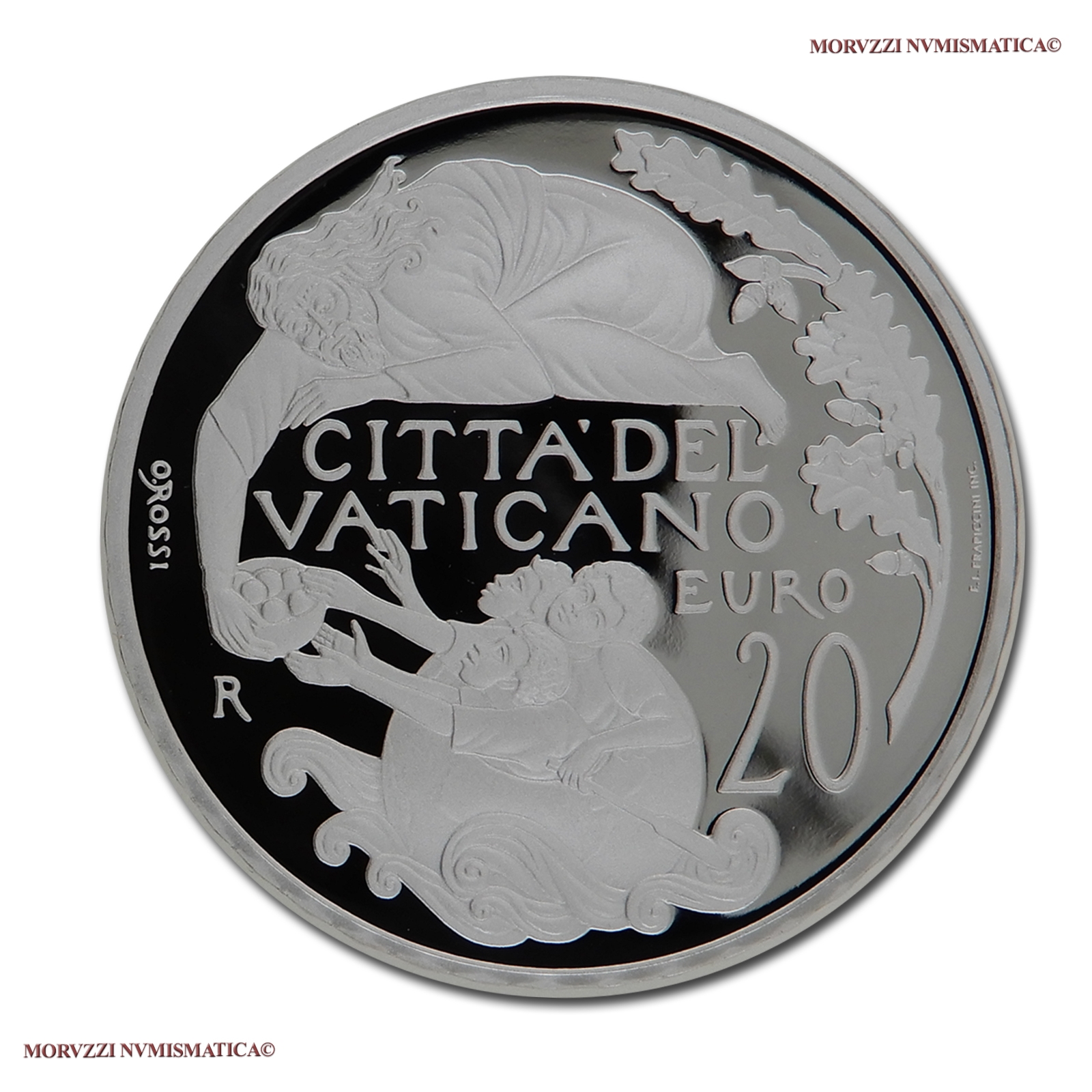 20 Euro in argento Valore nominale: 20 Euro Titolo: Ag 925/1000 Diametro: 36 mm Peso legale: 26 g Bordo circolare: godronato Versione: fondo specchio Scultore: O. Rossi - Incisore: E. L. Frapiccini