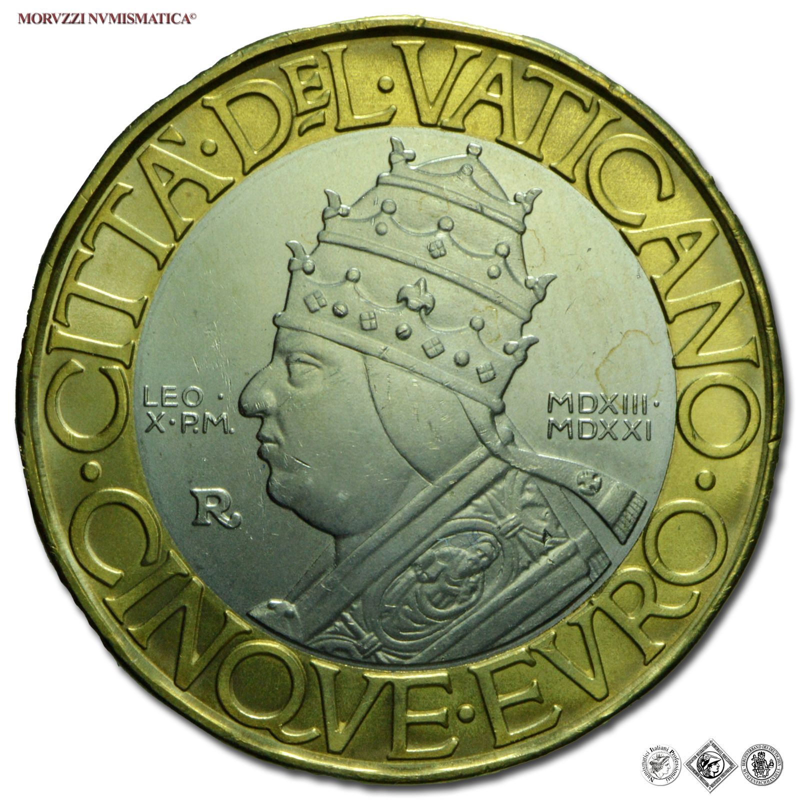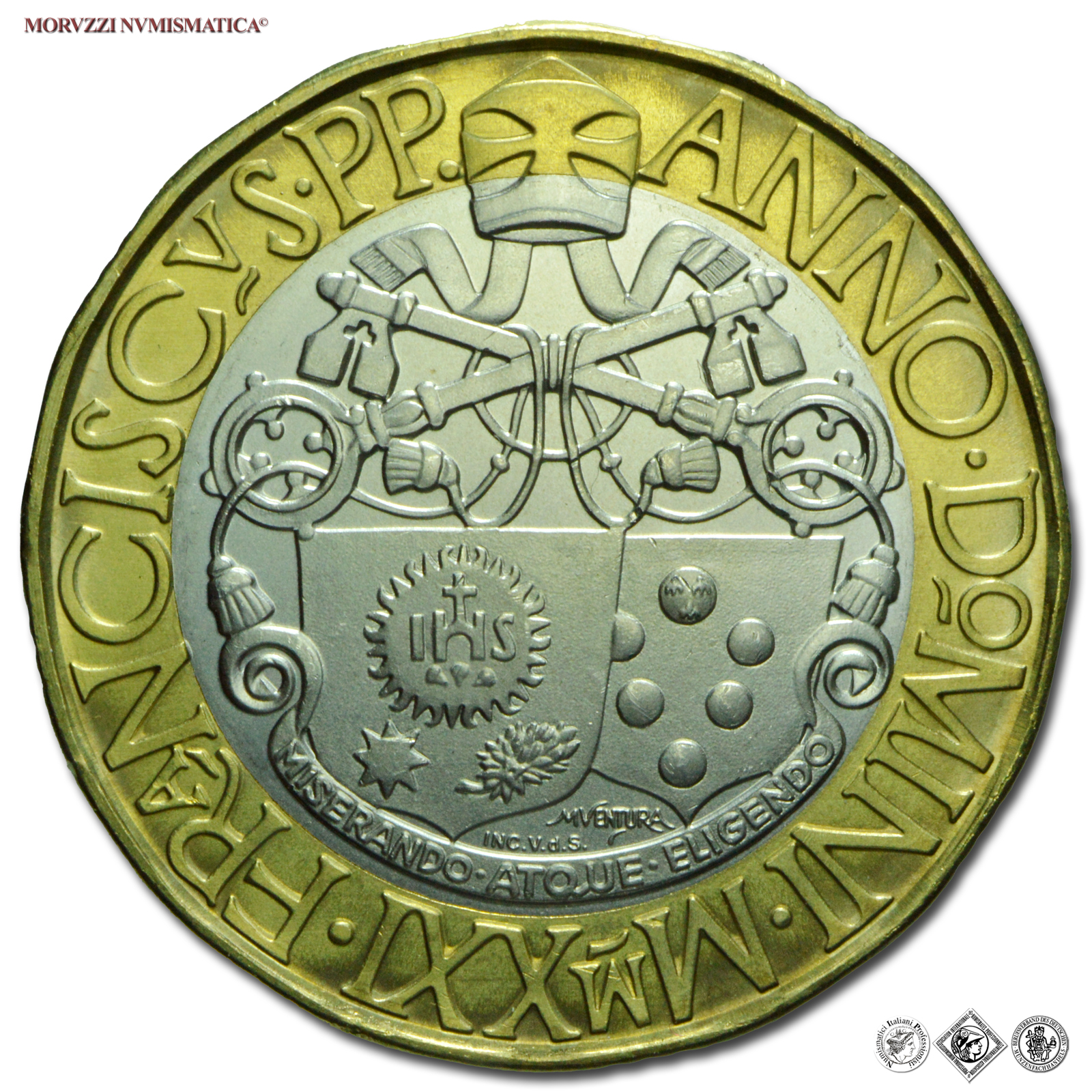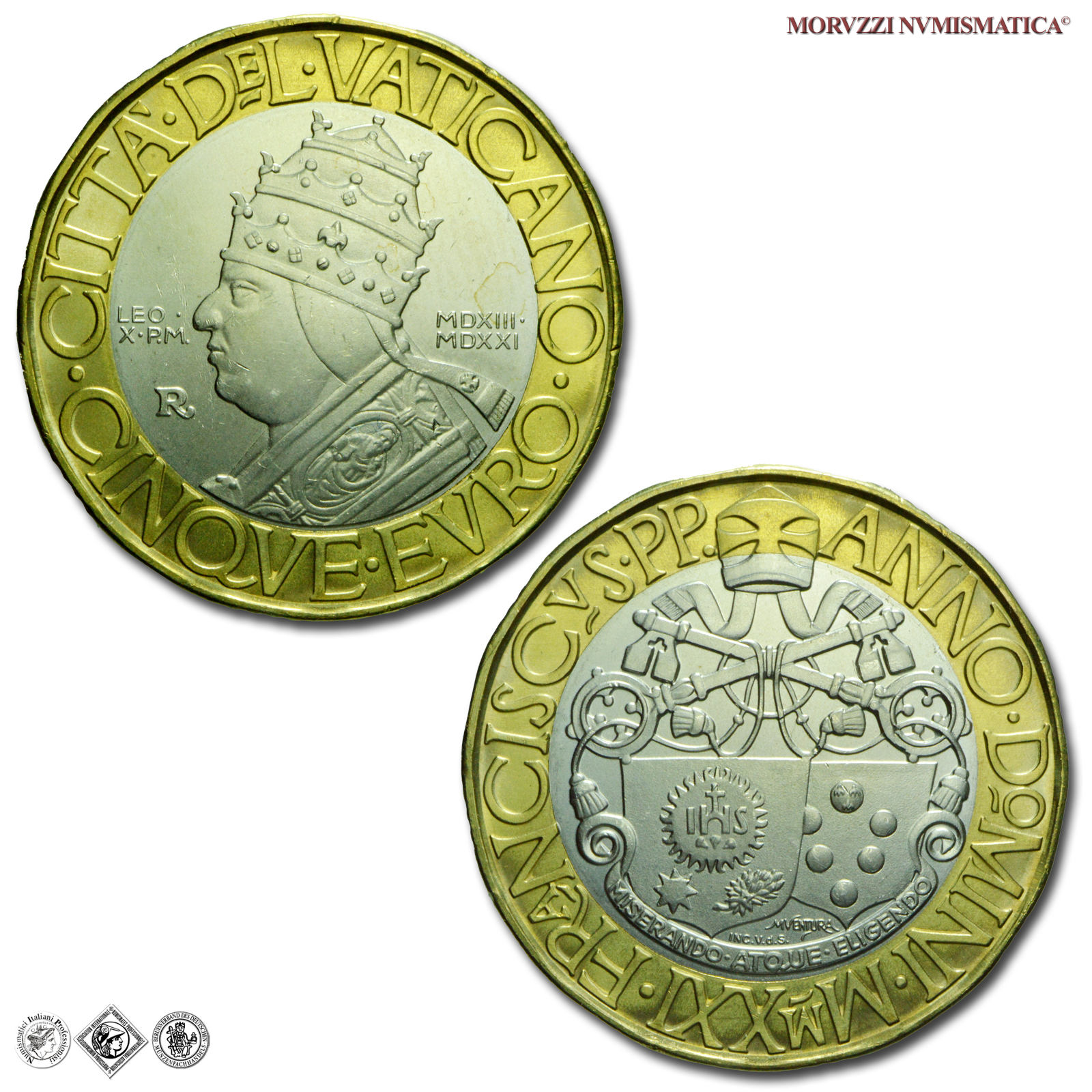 Papa Leone X, nato Giovanni di Lorenzo de’ Medici, è stato il 217° Papa della Chiesa Cattolica dal 1513 alla sua morte, il 1° dicembre 1521. Leone X, appartenente alla famiglia fiorentina tra le più potenti dell’epoca, fu un grande Papa del Rinascimento; durante il suo Pontificato apprezzò e sostenne Raffaello Sanzio, di cui è conservato un magnifico ritratto del Papa agli Uffizi di Firenze. Il ritratto di profilo di Marco Ventura è di grande efficacia, ispirato alla iconografia numismatica del Pontefice; sul dritto compaiono gli stemmi di Leone X e di papa Francesco.