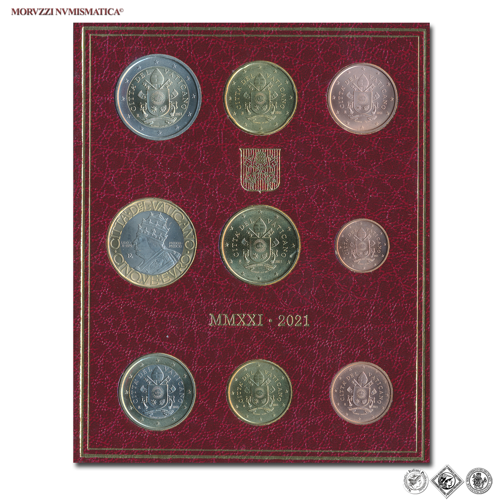 Città del Vaticano, FRANCESCO, Bergoglio, Dal 2013, serie annuale ufficiale (SERIE DIVISIONALE + 5 EURO BIMETALLICO celebrativo del V Centenario della morte di Papa Leone X), 9 valori, nella confezione originale della Città del Vaticano, Emissione: 2021, Zecca di Roma, Metallo: vari, FDC