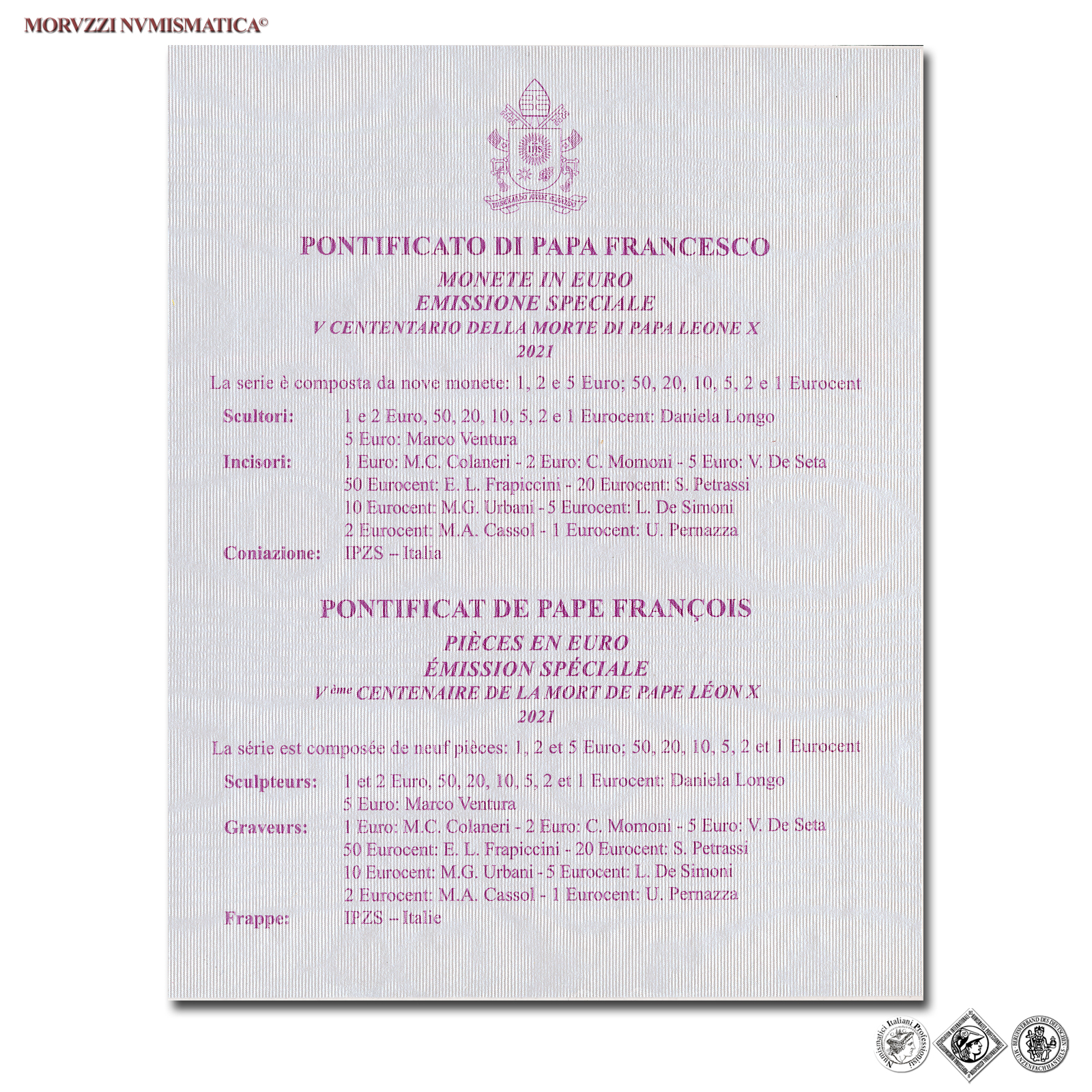 Tutte le monete, medaglie e banconote vendute dalla Moruzzi Numismatica di Roma sono garantite autentiche senza limite di tempo e accompagnate dal “Cartellino” con QR code e dal “Certificato fotografico di Autenticità e Provenienza”.